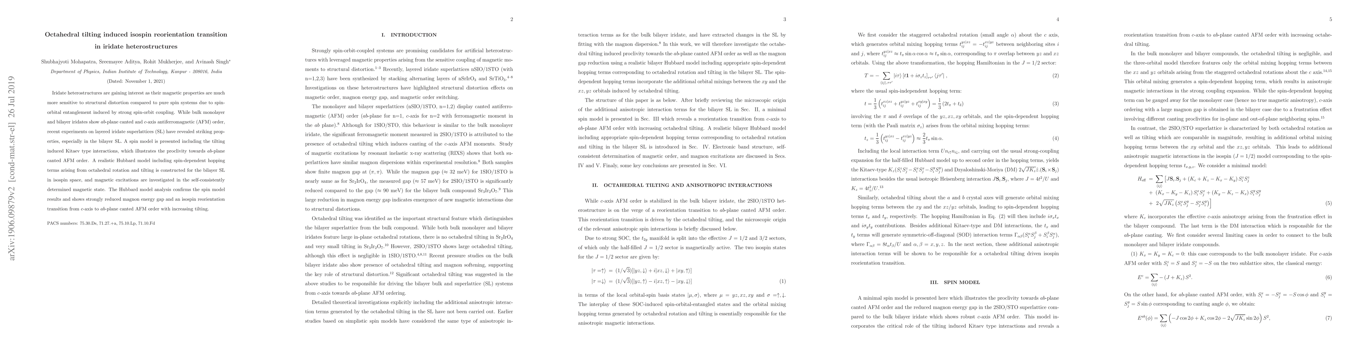This paper investigates the magnetic properties of iridate heterostructures, revealing that octahedral tilting induces an isospin reorientation transition from $c$-axis to $ab$-plane canted antiferromagnetic order. The study combines a spin model and a Hubbard model to demonstrate the effects of structural distortion on spin-orbital entanglement and magnon energy gap.