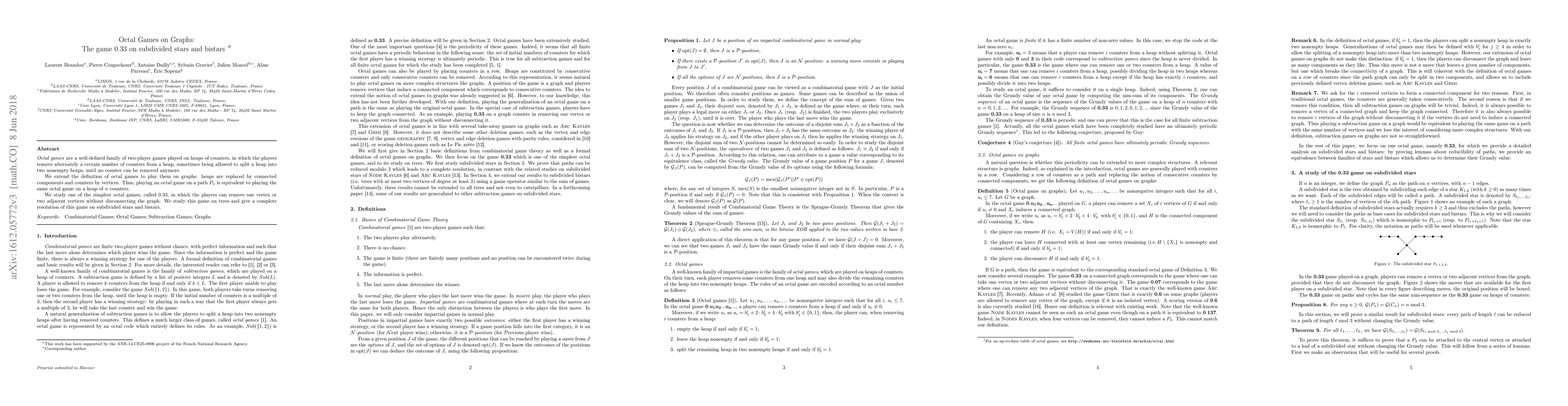 Octal games are a well-defined family of two-player games played on heaps of counters, in which the players remove alternately a certain number of counters from a heap, sometimes being allowed to split a heap into two nonempty heaps, until no counter can be removed anymore. We extend the definition of octal games to play them on graphs: heaps are replaced by connected components and counters by vertices. Thus, an octal game on a path P\_n is equivalent to playing the same octal game on a heap of n counters. We study one of the simplest octal games, called 0.33, in which the players can remove one vertex or two adjacent vertices without disconnecting the graph. We study this game on trees and give a complete resolution of this game on subdivided stars and bistars.