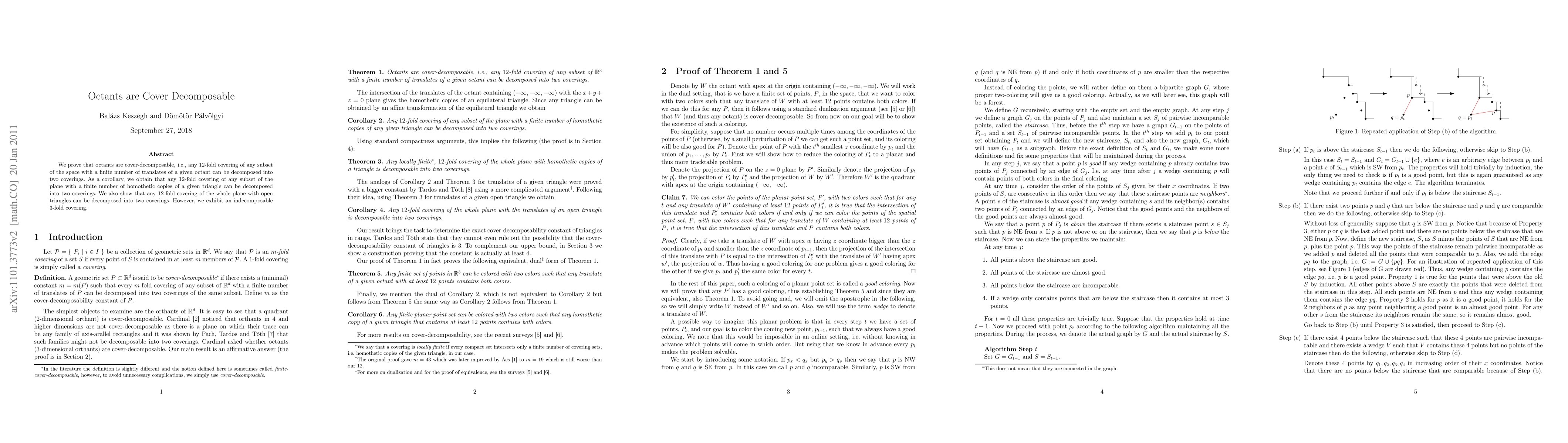 This paper proves that octants are cover-decomposable, allowing any 12-fold covering of subsets of space with translates of an octant to be decomposed into two coverings. As a corollary, similar decompositions apply to triangle coverings in the plane, but a 3-fold covering remains indecomposable.