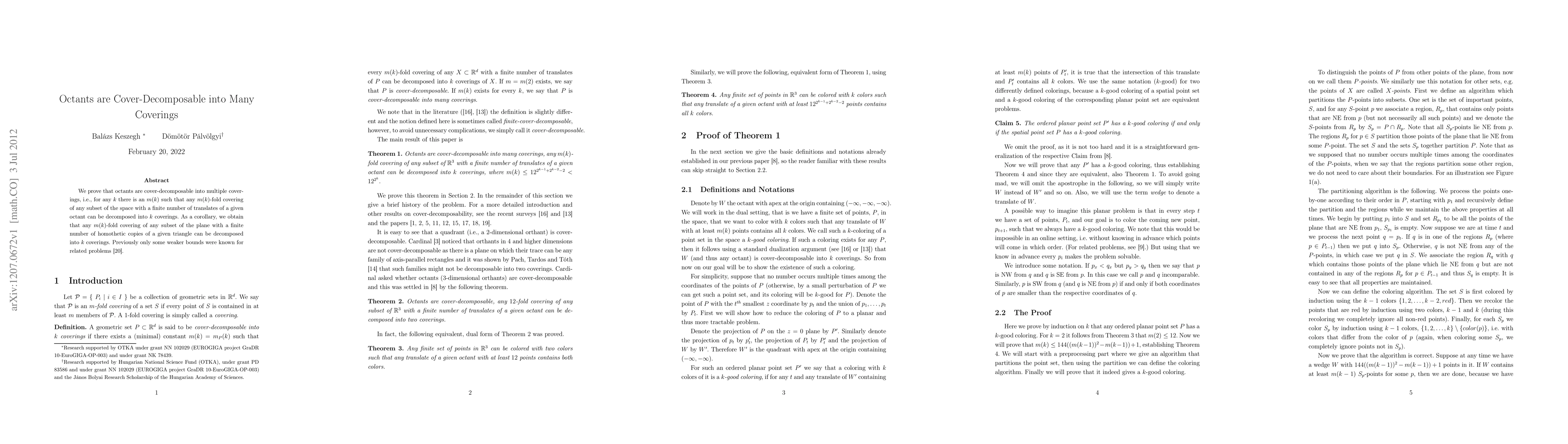 The paper presents a novel method for proving cover-decomposability of octants into multiple coverings using a dual setting and a k-good coloring approach, along with improved bounds for m(k).