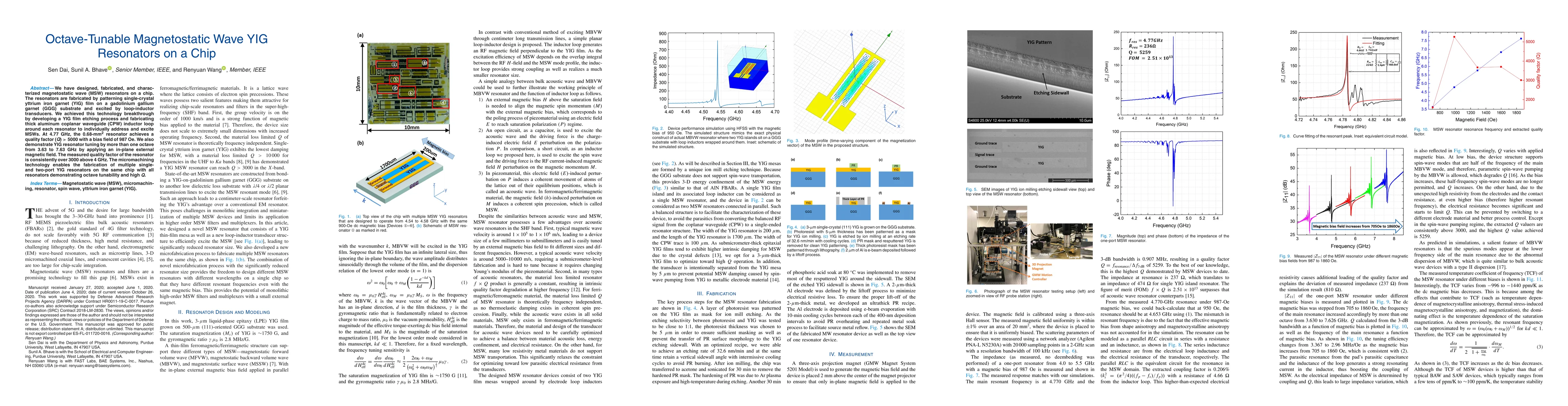 This paper details the development of octave-tunable magnetostatic wave resonators on a chip using single-crystal yttrium iron garnet (YIG) film on a gadolinium gallium garnet (GGG) substrate. The resonators achieve high quality factors and demonstrate tunability from 3.63 to 7.63 GHz by applying an external magnetic field.