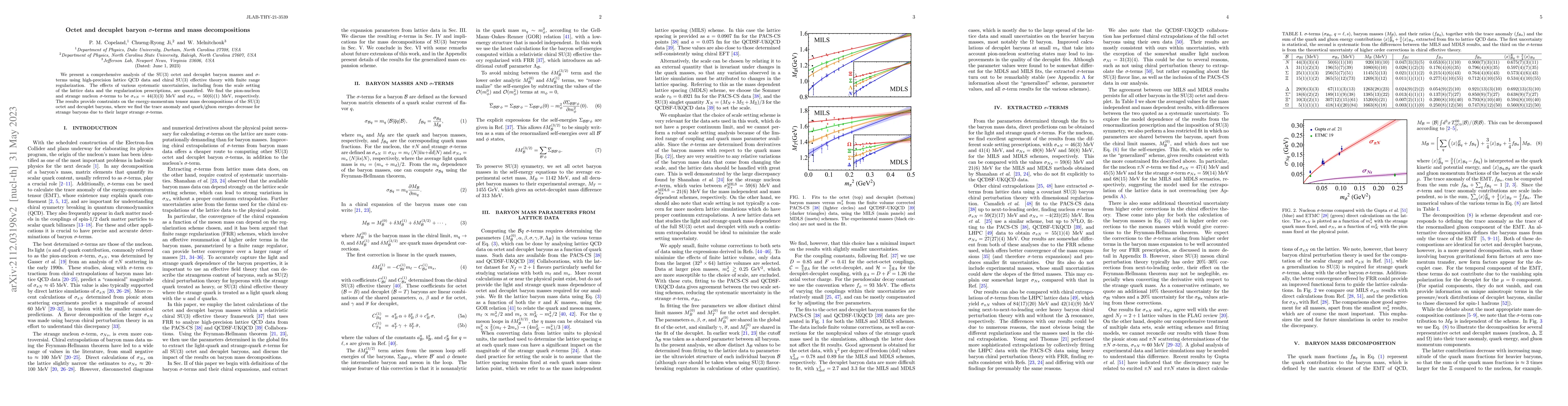 This paper analyzes SU(3) octet and decuplet baryon masses and $\sigma$-terms using lattice QCD and chiral SU(3) effective theory, finding $\sigma_{\pi N} = 44(3)(3)$ MeV and $\sigma_{N s} = 50(6)(1)$ MeV. It also provides insights into the energy-momentum tensor mass decompositions, revealing that quark/gluon energies decrease for strange baryons due to their larger strange $\sigma$-terms.