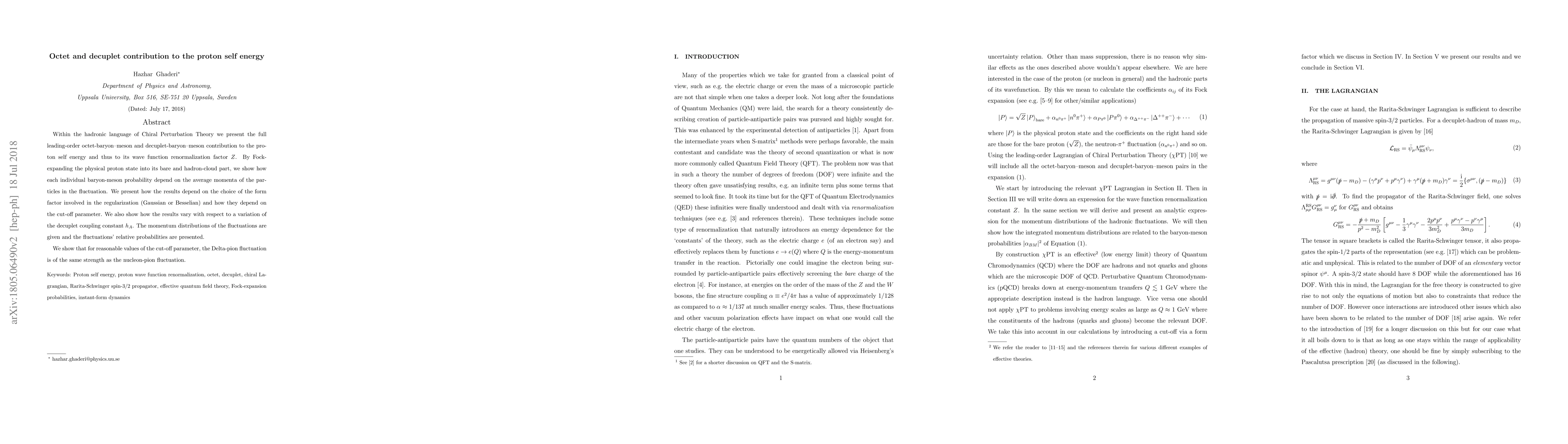 Within the hadronic language of Chiral Perturbation Theory we present the full leading-order octet-baryon$-$meson and decuplet-baryon$-$meson contribution to the proton self energy and thus to its wave function renormalization factor $Z$. By Fock-expanding the physical proton state into its bare and hadron-cloud part, we show how each individual baryon-meson probability depend on the average momenta of the particles in the fluctuation. We present how the results depend on the choice of the form factor involved in the regularization (Gaussian or Besselian) and how they depend on the cut-off parameter. We also show how the results vary with respect to a variation of the decuplet coupling constant $h_A$. The momentum distributions of the fluctuations are given and the fluctuations' relative probabilities are presented. We show that for reasonable values of the cut-off parameter, the Delta-pion fluctuation is of the same strength as the nucleon-pion fluctuation.