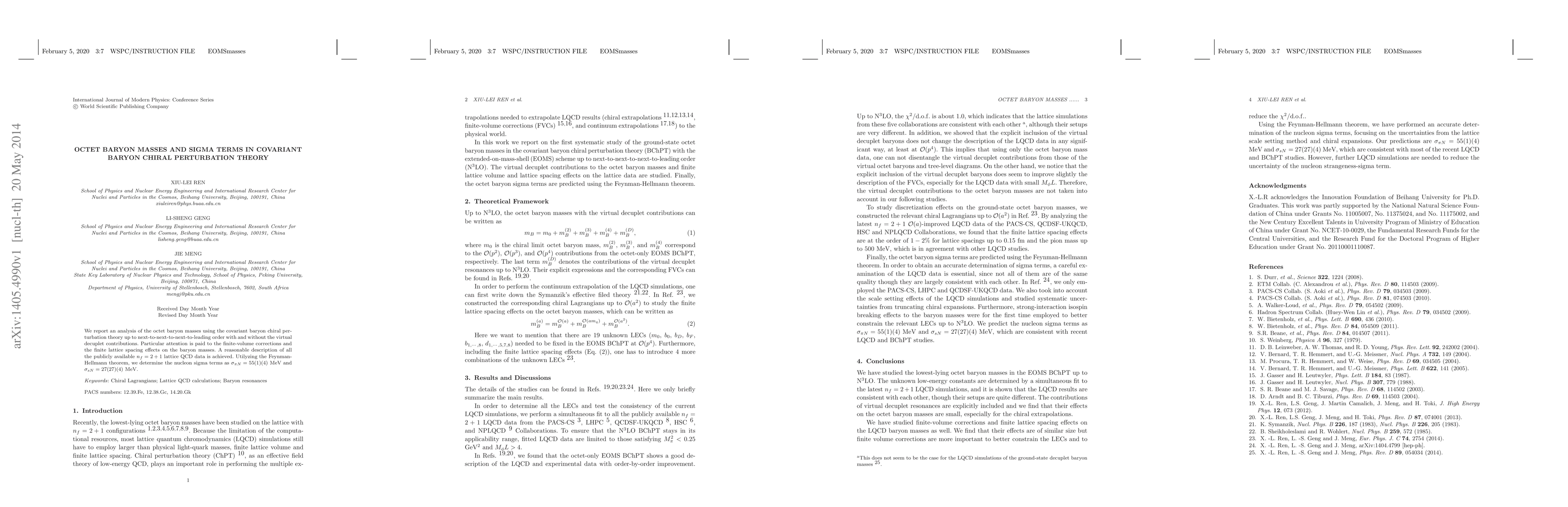 We report an analysis of the octet baryon masses using the covariant baryon chiral perturbation theory up to next-to-next-to-next-to-leading order with and without the virtual decuplet contributions. Particular attention is paid to the finite-volume corrections and the finite lattice spacing effects on the baryon masses. A reasonable description of all the publicly available $n_f=2+1$ lattice QCD data is achieved.Utilyzing the Feynman-Hellmann theorem, we determine the nucleon sigma terms as $\sigma_{\pi N}=55(1)(4)$ MeV and $\sigma_{sN}=27(27)(4)$ MeV.