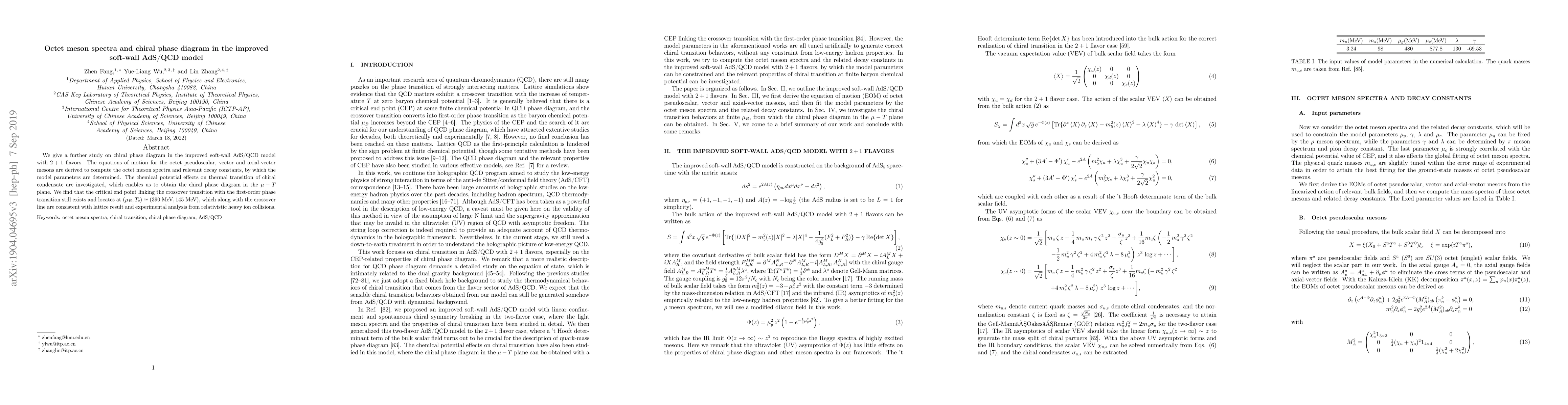 This paper studies the chiral phase diagram in the improved soft-wall AdS/QCD model with $2+1$ flavors, deriving equations for octet meson spectra and decay constants. It finds that the critical endpoint connecting crossover and first-order phase transitions remains at $(\mu_B, T_c) \simeq (390 \MeV, 145 \MeV)$, consistent with lattice data and heavy-ion collision experiments.