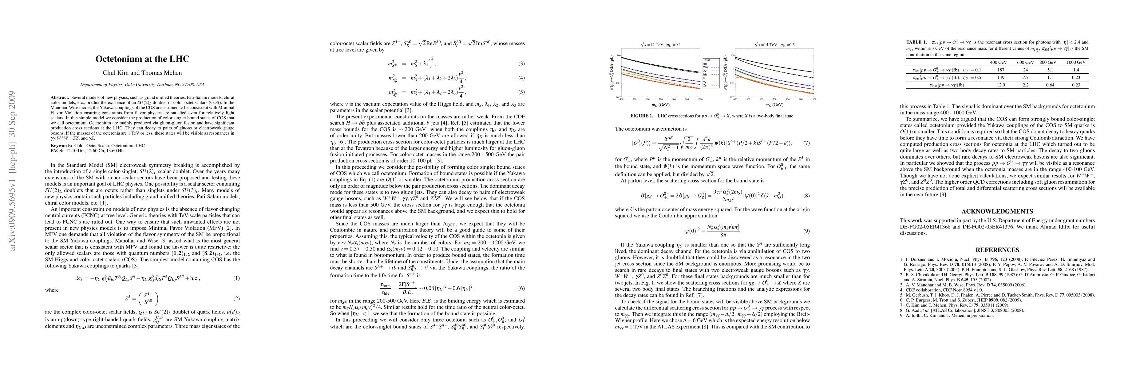 Several models of new physics, such as grand unified theories, Pati-Salam models, chiral color models, etc., predict the existence of an $SU(2)_L$ doublet of color-octet scalars (COS). In the Manohar-Wise model, the Yukawa couplings of the COS are assumed to be consistent with Minimal Flavor Violation ensuring constraints from flavor physics are satisfied even for relatively light scalars. In this simple model we consider the production of color singlet bound states of COS that we call octetonium. Octetonium are mainly produced via gluon-gluon fusion and have significant production cross sections at the LHC. They can decay to pairs of gluons or electroweak gauge bosons. If the masses of the octetonia are 1 TeV or less, these states will be visible as resonances in $\gamma \gamma, W^+W^-, ZZ$, and $ \gamma Z$.