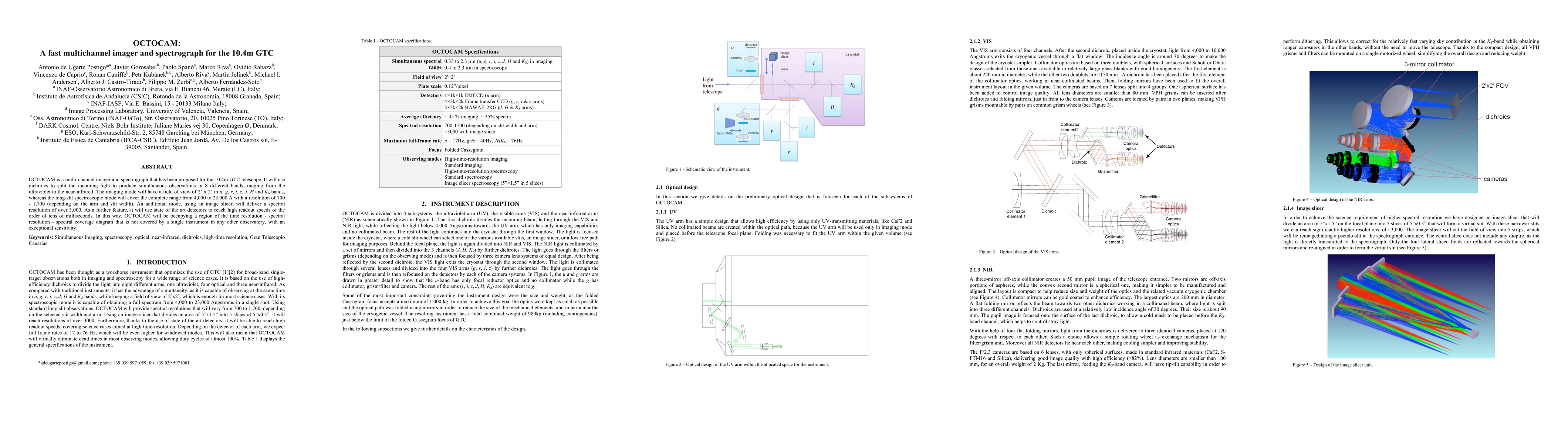 OCTOCAM is a multi-channel imager and spectrograph that has been proposed for the 10.4m GTC telescope. It will use dichroics to split the incoming light to produce simultaneous observations in 8 different bands, ranging from the ultraviolet to the near-infrared. The imaging mode will have a field of view of 2' x 2' in u, g, r, i, z, J, H and Ks bands, whereas the long-slit spectroscopic mode will cover the complete range from 4,000 to 23,000 {\AA} with a resolution of 700 - 1,700 (depending on the arm and slit width). An additional mode, using an image slicer, will deliver a spectral resolution of over 3,000. As a further feature, it will use state of the art detectors to reach high readout speeds of the order of tens of milliseconds. In this way, OCTOCAM will be occupying a region of the time resolution - spectral resolution - spectral coverage diagram that is not covered by a single instrument in any other observatory, with an exceptional sensitivity.