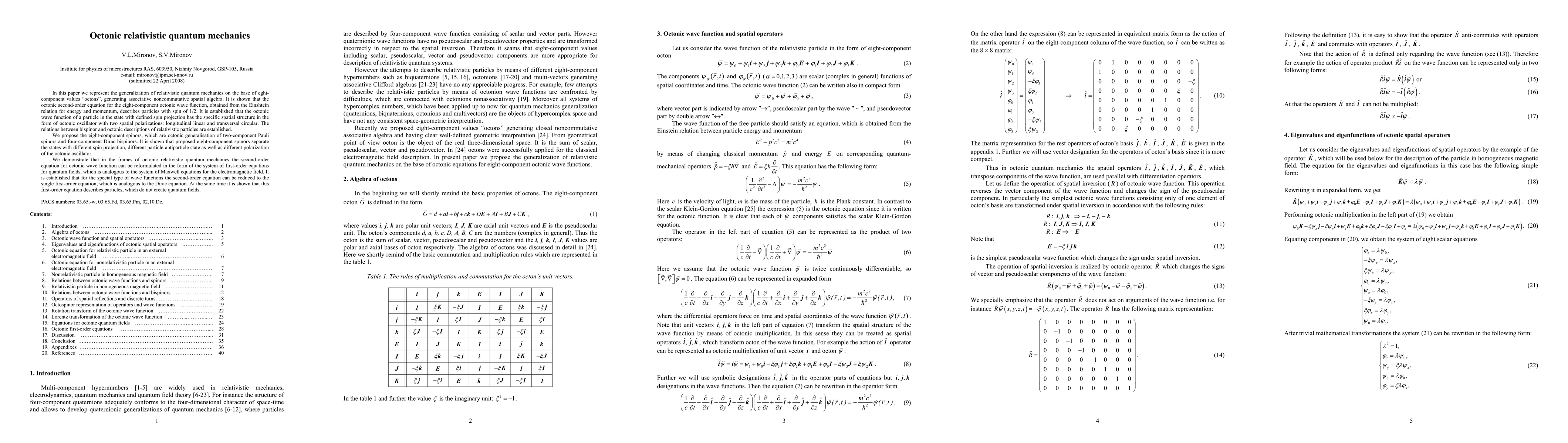 In this paper we represent the generalization of relativistic quantum mechanics on the base of eght-component values "octons", generating associative noncommutative spatial algebra. It is shown that the octonic second-order equation for the eight-component octonic wave function, obtained from the Einshtein relation for energy and momentum, describes particles with spin of 1/2. It is established that the octonic wave function of a particle in the state with defined spin projection has the specific spatial structure in the form of octonic oscillator with two spatial polarizations: longitudinal linear and transversal circular. The relations between bispinor and octonic descriptions of relativistic particles are established. We propose the eight-component spinors, which are octonic generalisation of two-component Pauli spinors and four-component Dirac bispinors. It is shown that proposed eight-component spinors separate the states with different spin projection, different particle-antiparticle state as well as different polarization of the octonic oscillator. We demonstrate that in the frames of octonic relativistic quantum mechanics the second-order equation for octonic wave function can be reformulated in the form of the system of first-order equations for quantum fields, which is analogous to the system of Maxwell equations for the electromagnetic field. It is established that for the special type of wave functions the second-order equation can be reduced to the single first-order equation, which is analogous to the Dirac equation. At the same time it is shown that this first-order equation describes particles, which do not create quantum fields.