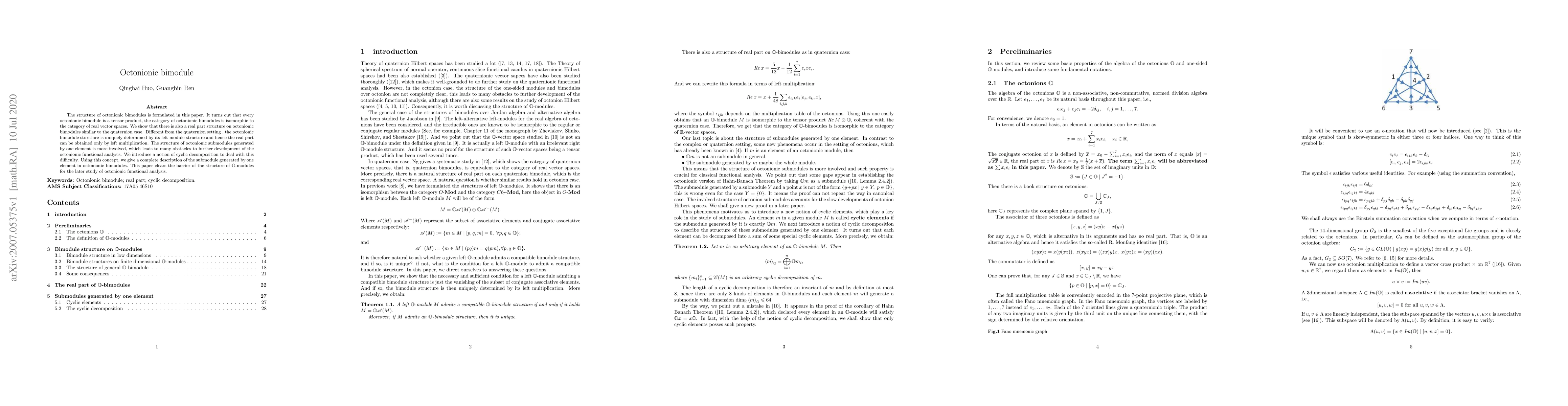 This paper formulates the structure of octonionic bimodules, showing they are tensor products and their category is isomorphic to real vector spaces. It introduces a real part structure on octonionic bimodules, uniquely determined by their left module structure, and uses cyclic decomposition to describe submodules generated by one element, paving the way for future octonionic functional analysis.