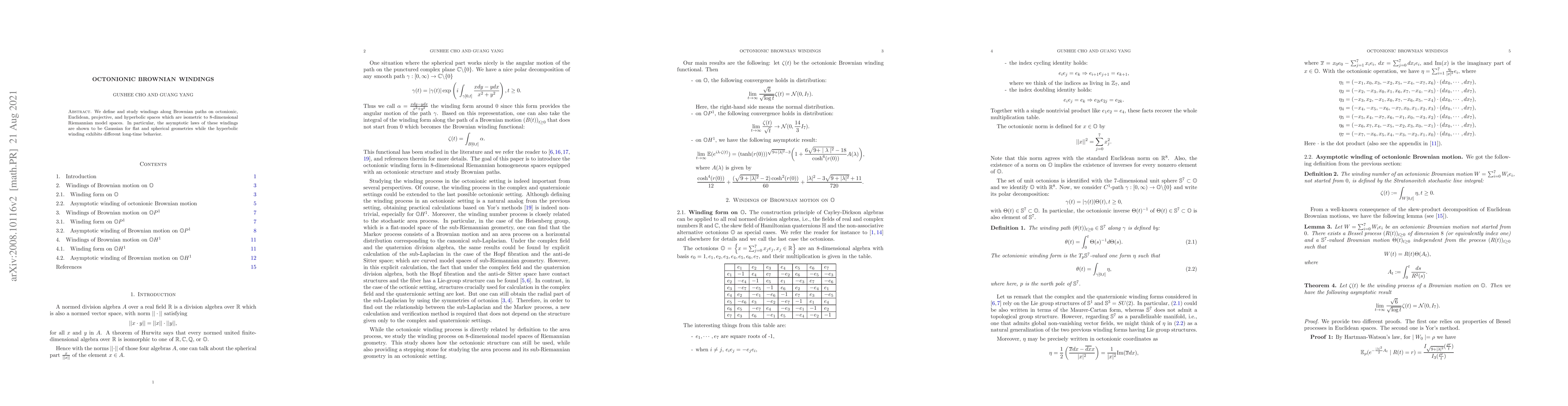 Researchers studied Brownian paths in 8-dimensional spaces with flat, spherical, and hyperbolic geometries, finding that the windings' long-term behavior follows Gaussian laws for flat and spherical cases, but deviates from this pattern in hyperbolic geometry.