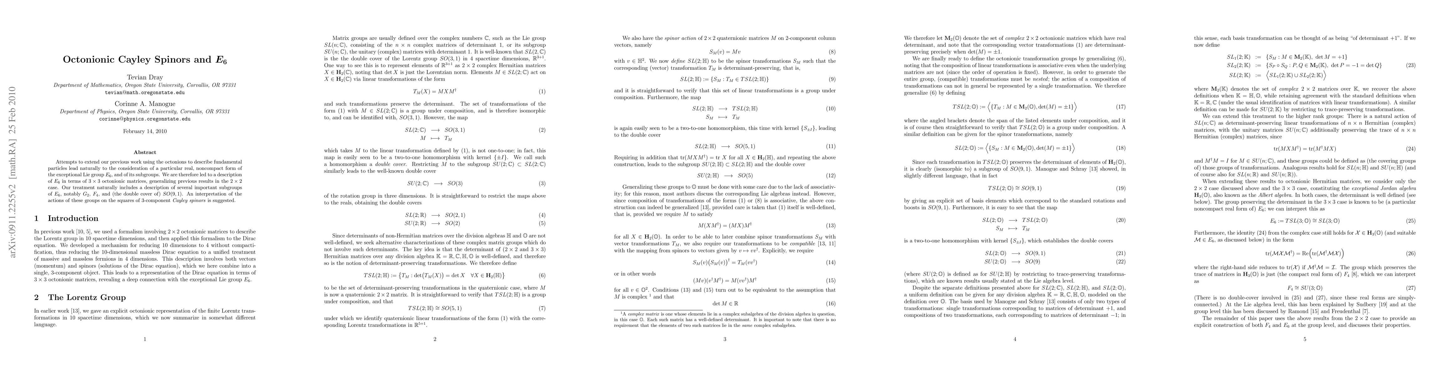 The paper presents a novel description of E6 using 3x3 octonionic matrices, identifies key subgroups, and elucidates their actions on Cayley spinors, thereby contributing to the theoretical understanding of exceptional Lie groups in physics.