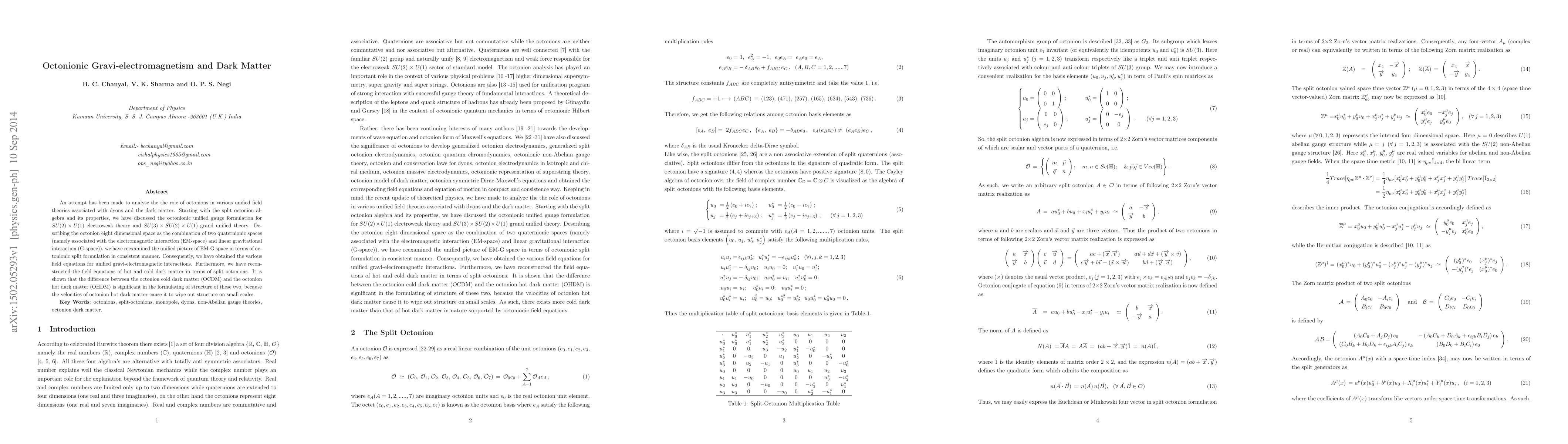 An attempt has been made to analyse the the role of octonions in various unified field theories associated with dyons and the dark matter. Starting with the split octonion al- gebra and its properties, we have discussed the octonionic unified gauge formulation for SU(2) ?X U(1) electroweak theory and SU(3) X? SU(2) ?X U(1) grand unified theory. De- scribing the octonion eight dimensional space as the combination of two quaternionic spaces (namely associated with the electromagnetic interaction (EM-space) and linear gravitational interaction (G-space)), we have reexamined the unified picture of EM-G space in terms of oc- tonionic split formulation in consistent manner. Consequently, we have obtained the various field equations for unified gravi-electromagnetic interactions. Furthermore, we have recon- structed the field equations of hot and cold dark matter in terms of split octonions. It is shown that the difference between the octonion cold dark matter (OCDM) and the octonion hot dark matter (OHDM) is significant in the formulating of structure of these two, because the velocities of octonion hot dark matter cause it to wipe out structure on small scales.