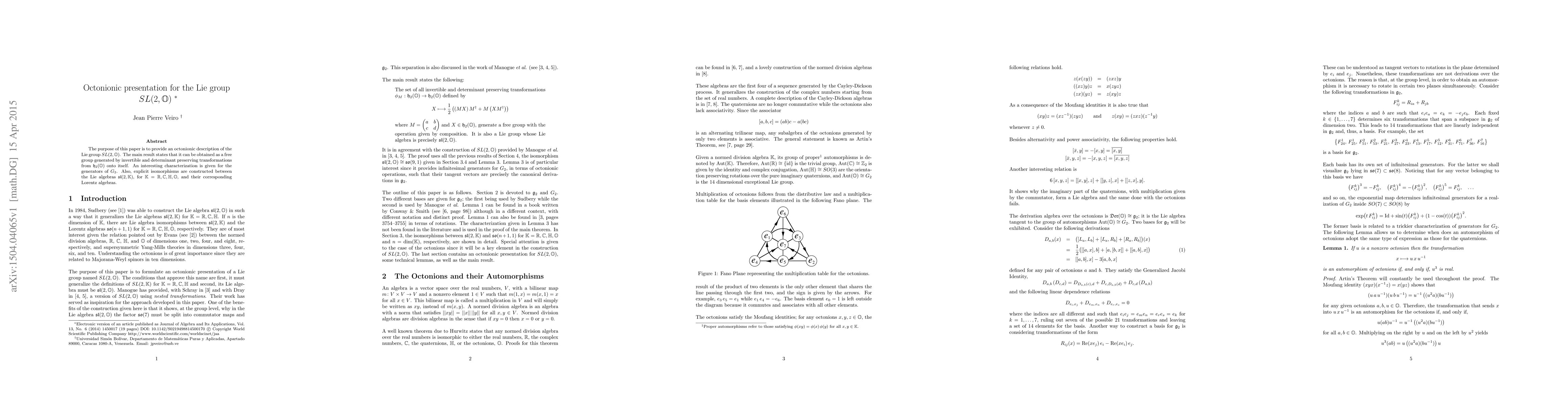 The purpose of this paper is to provide an octonionic description of the Lie group $SL(2,{\mathbb O})$. The main result states that it can be obtained as a free group generated by invertible and determinant preserving transformations from $\mathfrak{h}_2({\mathbb O})$ onto itself. An interesting characterization is given for the generators of $G_2$. Also, explicit isomorphisms are constructed between the Lie algebras $\mathfrak{sl}(2,{\mathbb K})$, for ${\mathbb K}={\mathbb R}, {\mathbb C}, {\mathbb H}, {\mathbb O}$, and their corresponding Lorentz algebras.