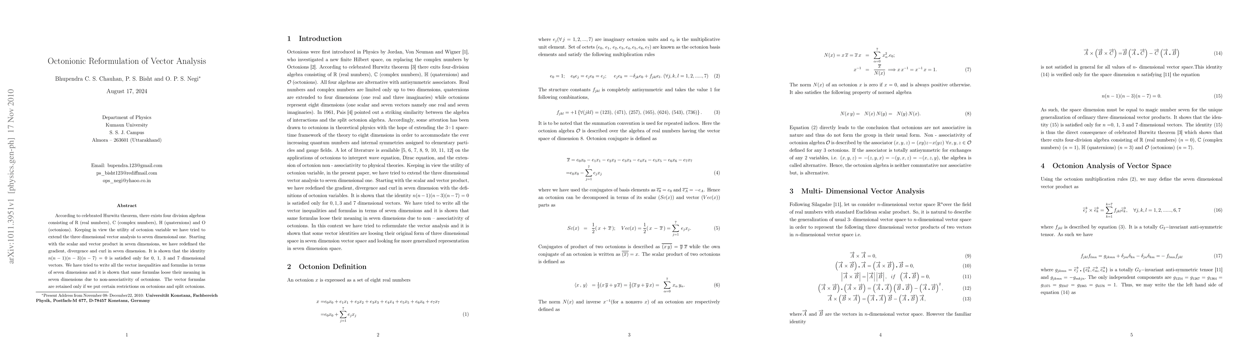 According to celebrated Hurwitz theorem, there exists four division algebras consisting of R (real numbers), C (complex numbers), H (quaternions) and O (octonions). Keeping in view the utility of octonion variable we have tried to extend the three dimensional vector analysis to seven dimensional one. Starting with the scalar and vector product in seven dimensions, we have redefined the gradient, divergence and curl in seven dimension. It is shown that the identity n(n-1)(n-3)(n-7)=0 is satisfied only for 0, 1, 3 and 7 dimensional vectors. We have tried to write all the vector inequalities and formulas in terms of seven dimensions and it is shown that same formulas loose their meaning in seven dimensions due to non-associativity of octonions. The vector formulas are retained only if we put certain restrictions on octonions and split octonions.