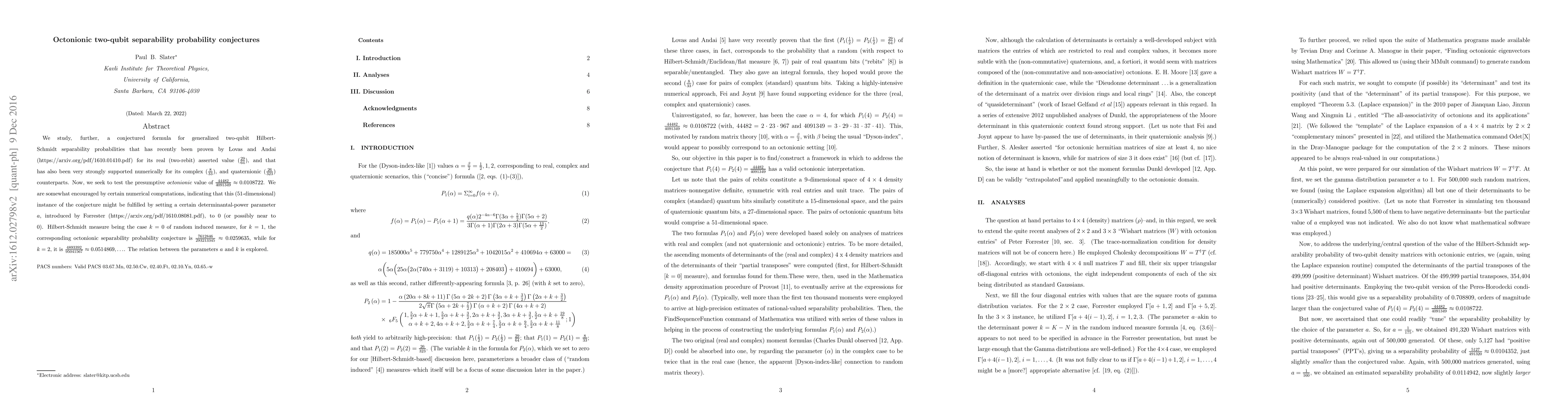We study, further, a conjectured formula for generalized two-qubit Hilbert-Schmidt separability probabilities that has recently been proven by Lovas and Andai (https://arxiv.org/pdf/1610.01410.pdf) for its real (two-rebit) asserted value ($\frac{29}{64}$), and that has also been very strongly supported numerically for its complex ($\frac{8}{33}$), and quaternionic ($\frac{26}{323}$) counterparts. Now, we seek to test the presumptive octonionic value of $\frac{44482}{4091349} \approx 0.0108722$. We are somewhat encouraged by certain numerical computations, indicating that this (51-dimensional) instance of the conjecture might be fulfilled by setting a certain determinantal-power parameter $a$, introduced by Forrester (https://arxiv.org/pdf/1610.08081.pdf), to 0 (or possibly near to 0). Hilbert-Schmidt measure being the case $k=0$ of random induced measure, for $k=1$, the corresponding octonionic separability probability conjecture is $\frac{7612846}{293213345} \approx 0.0259635$, while for $k=2$, it is $\frac{4893392}{95041567} \approx 0.0514869, \ldots$. The relation between the parameters $a$ and $k$ is explored.