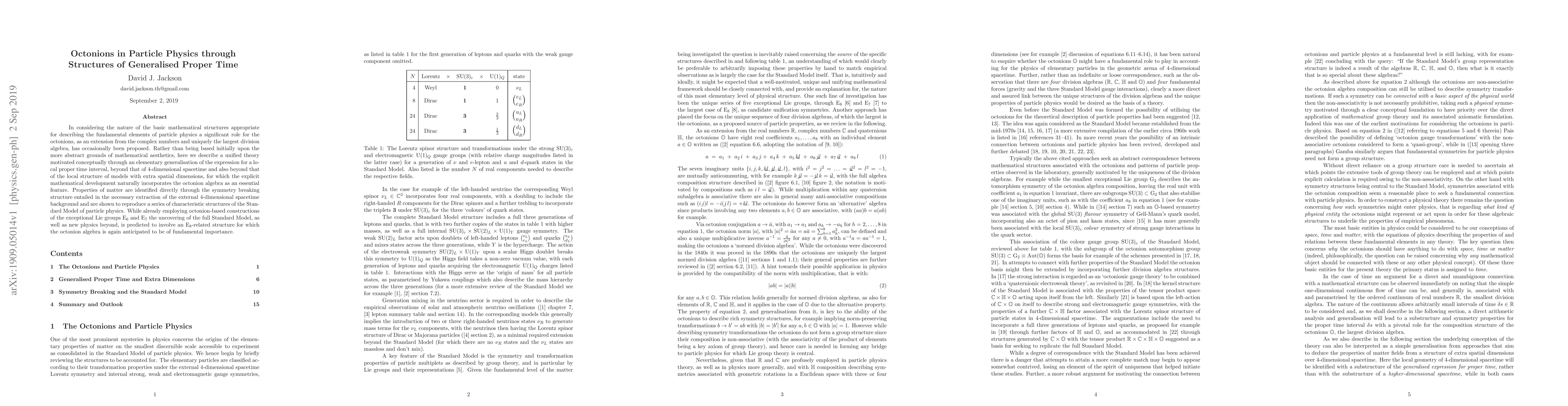 This paper proposes a unified particle physics theory using octonions, an extension of complex numbers, as a fundamental mathematical structure. The theory generalizes proper time intervals beyond 4D spacetime and extra spatial dimensions, naturally incorporating octonion algebra. It identifies matter properties via symmetry breaking and reproduces Standard Model structures, predicting new physics involving E8-related structures and further octonion importance.