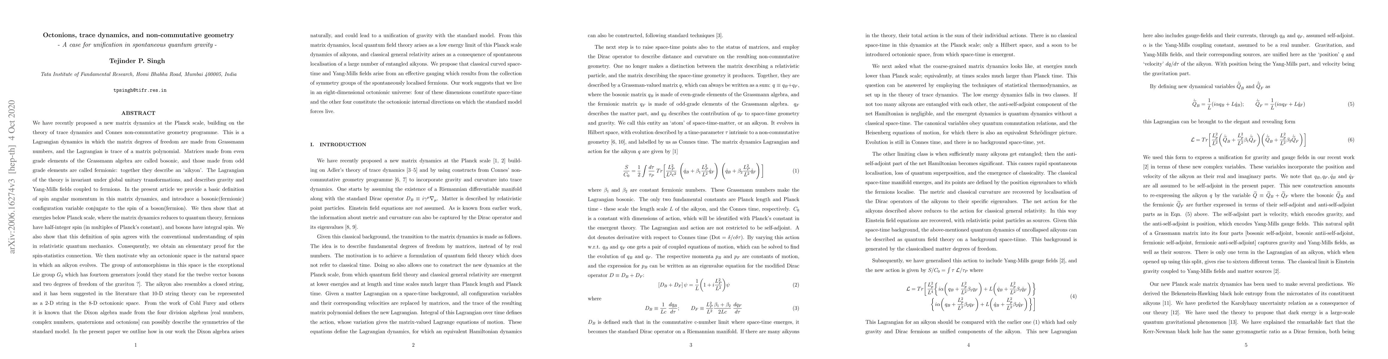 We have recently proposed a new matrix dynamics at the Planck scale, building on the theory of trace dynamics. This is a Lagrangian dynamics in which the matrix degrees of freedom are made from Grassmann numbers, and the Lagrangian is trace of a matrix polynomial. Matrices made from even grade elements of the Grassmann algebra are called bosonic, and those made from odd grade elements are called fermionic: together they describe an `aikyon'. In the present article we provide a basic definition of spin angular momentum in this matrix dynamics, and introduce a bosonic (fermionic) configuration variable conjugate to the spin of a boson (fermion). We then show that at energies below Planck scale, where the matrix dynamics reduces to quantum theory, fermions have half-integer spin (in multiples of Planck's constant), and bosons have integral spin. We also show that this definition of spin agrees with the conventional understanding of spin in relativistic quantum mechanics. Consequently, we obtain an elementary proof for the spin-statistics connection. We then motivate why an octonionic space is the natural space in which an aikyon evolves. The group of automorphisms in this space is the exceptional Lie group $G_2$ which has fourteen generators [could they stand for the twelve vector bosons and two degrees of freedom of the graviton? ]. The aikyon also resembles a closed string, and it has been suggested in the literature that 10-D string theory can be represented as a 2-D string in the 8-D octonionic space. From the work of Cohl Furey and others it is known that the Dixon algebra made from the four division algebras [real numbers, complex numbers, quaternions and octonions] can possibly describe the symmetries of the standard model. In the present paper we outline how in our work the Dixon algebra arises naturally, and could lead to a unification of gravity with the standard model.