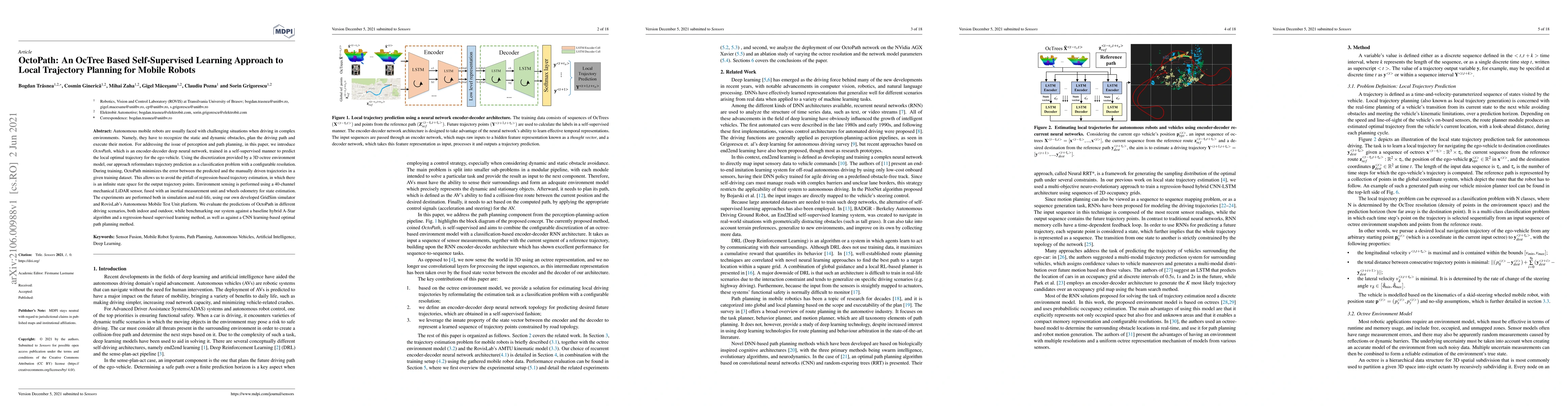 Autonomous mobile robots are usually faced with challenging situations when driving in complex environments. Namely, they have to recognize the static and dynamic obstacles, plan the driving path and execute their motion. For addressing the issue of perception and path planning, in this paper, we introduce OctoPath , which is an encoder-decoder deep neural network, trained in a self-supervised manner to predict the local optimal trajectory for the ego-vehicle. Using the discretization provided by a 3D octree environment model, our approach reformulates trajectory prediction as a classification problem with a configurable resolution. During training, OctoPath minimizes the error between the predicted and the manually driven trajectories in a given training dataset. This allows us to avoid the pitfall of regression-based trajectory estimation, in which there is an infinite state space for the output trajectory points. Environment sensing is performed using a 40-channel mechanical LiDAR sensor, fused with an inertial measurement unit and wheels odometry for state estimation. The experiments are performed both in simulation and real-life, using our own developed GridSim simulator and RovisLab's Autonomous Mobile Test Unit platform. We evaluate the predictions of OctoPath in different driving scenarios, both indoor and outdoor, while benchmarking our system against a baseline hybrid A-Star algorithm and a regression-based supervised learning method, as well as against a CNN learning-based optimal path planning method.