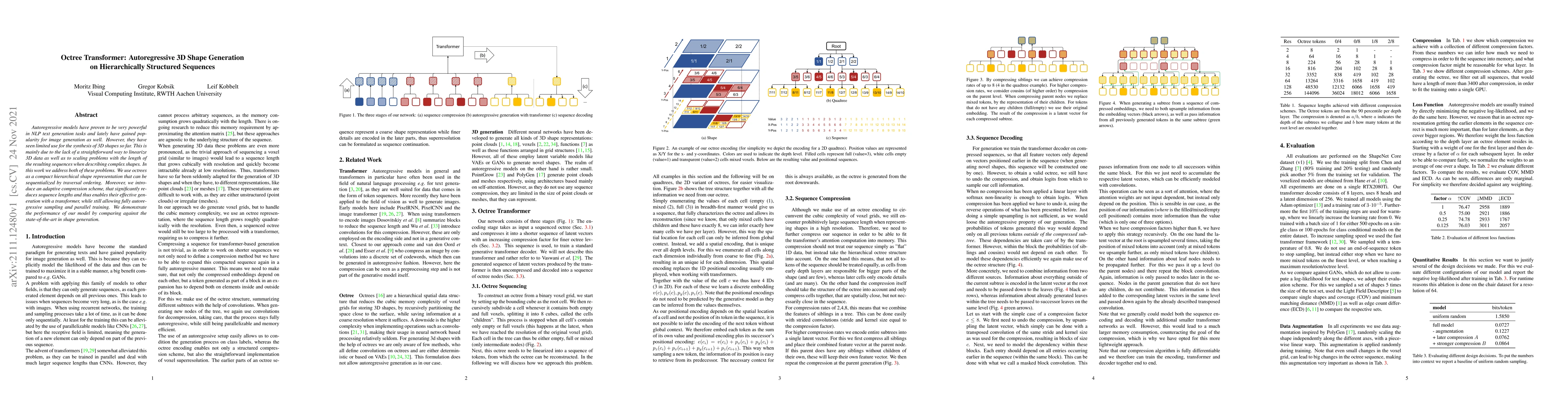 This paper proposes an octree-based transformer model for autoregressive 3D shape generation, addressing the challenge of linearizing 3D data and scaling issues with long sequences. The model uses an adaptive compression scheme to reduce sequence lengths, enabling effective generation while maintaining autoregressive sampling and parallel training.