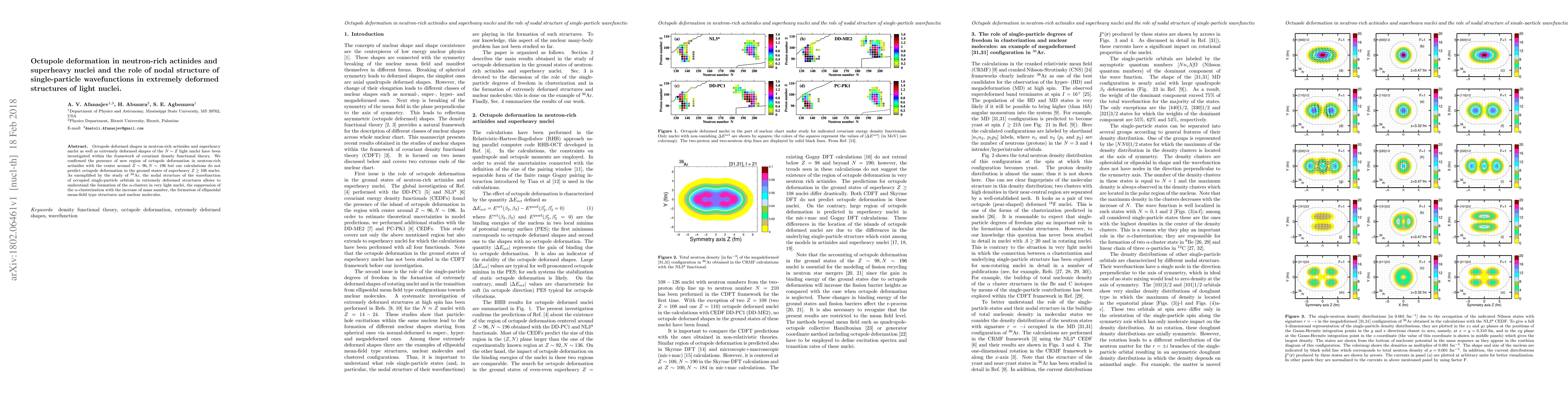 This research investigates octupole deformation in neutron-rich actinides and superheavy nuclei using covariant density functional theory, identifying a new region of octupole deformation in actinides around Z~96, N~196, while finding no such deformation in superheavy nuclei. It also explores the nodal structure of single-particle wavefunctions in extremely deformed light nuclei, explaining phenomena like alpha-cluster formation and suppression.