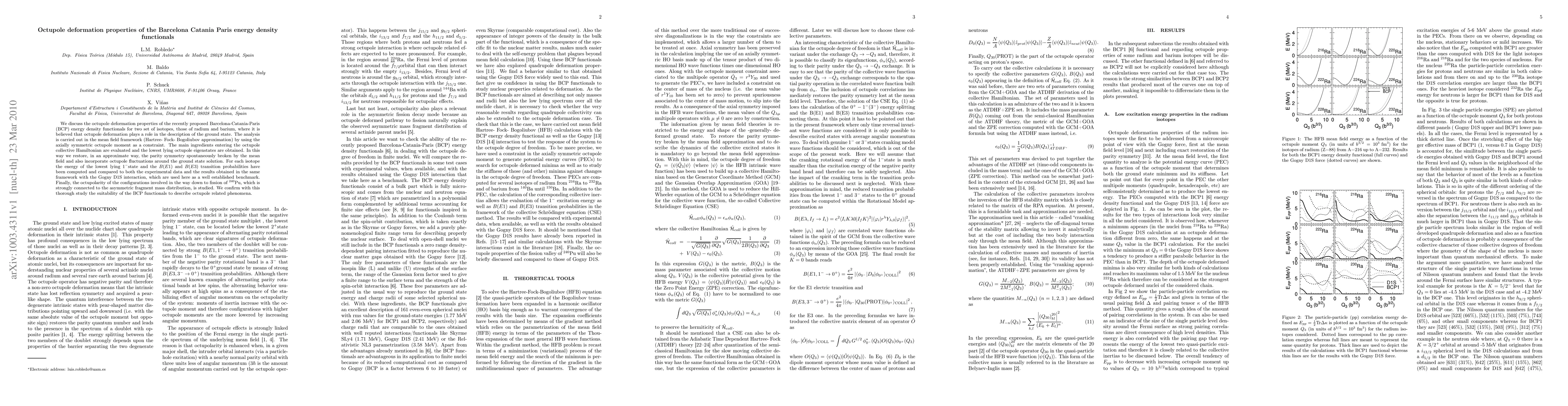 This study analyzes the octupole deformation properties of the Barcelona-Catania-Paris energy density functionals using radium and barium isotopes. Employing the Hartree-Fock-Bogoliubov approximation, it restores parity symmetry and incorporates octupole fluctuations. The research computes energies and transition probabilities, comparing them to experimental data and Gogny D1S interaction results. It confirms the suitability of BCP functionals for describing octupole-related phenomena, including the fission of $^{240}$Pu.