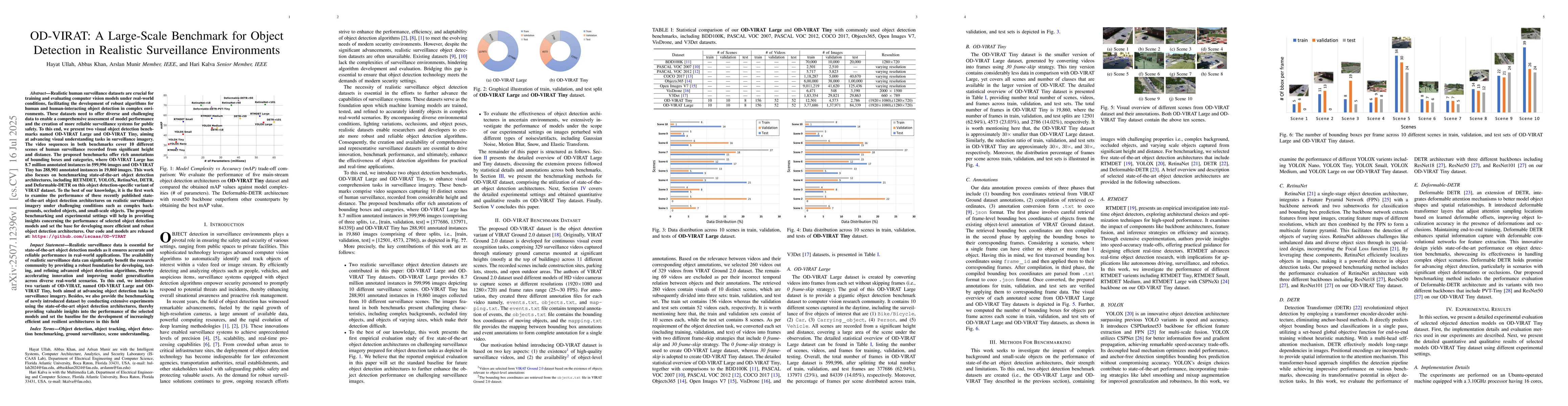 Realistic human surveillance datasets are crucial for training and evaluating computer vision models under real-world conditions, facilitating the development of robust algorithms for human and human-interacting object detection in complex environments. These datasets need to offer diverse and challenging data to enable a comprehensive assessment of model performance and the creation of more reliable surveillance systems for public safety. To this end, we present two visual object detection benchmarks named OD-VIRAT Large and OD-VIRAT Tiny, aiming at advancing visual understanding tasks in surveillance imagery. The video sequences in both benchmarks cover 10 different scenes of human surveillance recorded from significant height and distance. The proposed benchmarks offer rich annotations of bounding boxes and categories, where OD-VIRAT Large has 8.7 million annotated instances in 599,996 images and OD-VIRAT Tiny has 288,901 annotated instances in 19,860 images. This work also focuses on benchmarking state-of-the-art object detection architectures, including RETMDET, YOLOX, RetinaNet, DETR, and Deformable-DETR on this object detection-specific variant of VIRAT dataset. To the best of our knowledge, it is the first work to examine the performance of these recently published state-of-the-art object detection architectures on realistic surveillance imagery under challenging conditions such as complex backgrounds, occluded objects, and small-scale objects. The proposed benchmarking and experimental settings will help in providing insights concerning the performance of selected object detection models and set the base for developing more efficient and robust object detection architectures.