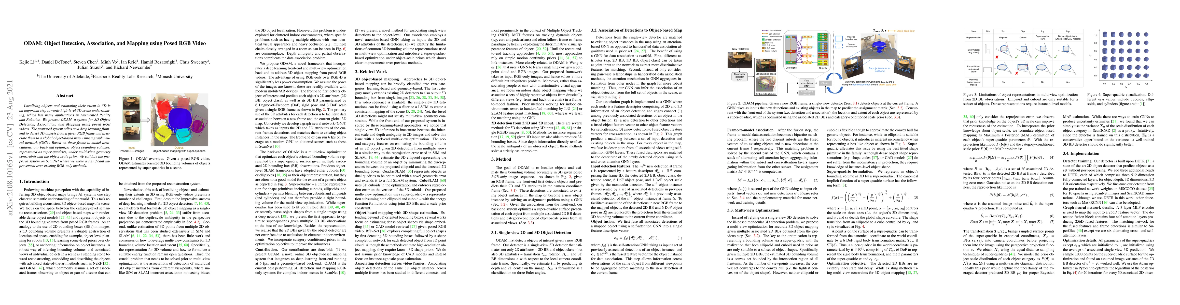 ODAM is a system for 3D object detection, association, and mapping using posed RGB videos, leveraging deep learning and graph neural networks to enhance 3D scene understanding. It optimizes object bounding volumes under multi-view geometry constraints, demonstrating significant improvement over existing RGB-only methods on ScanNet.