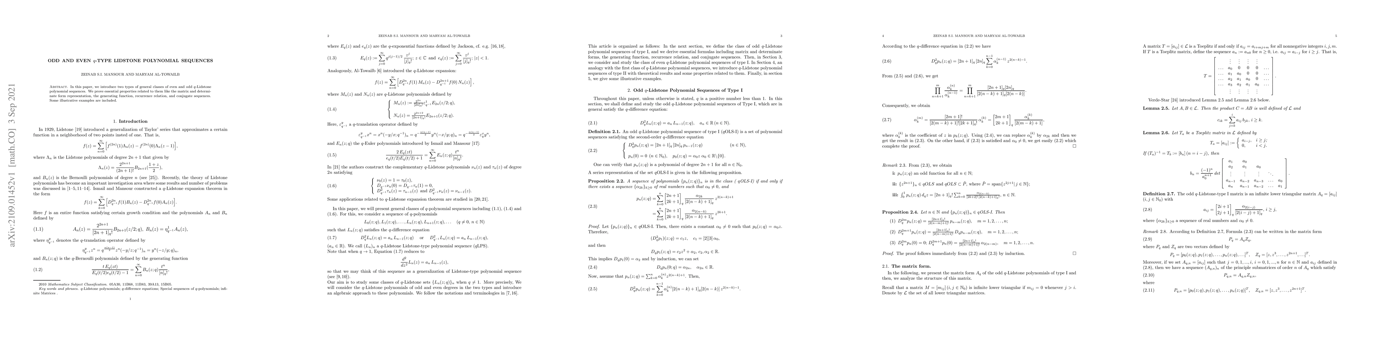 In this paper, we introduce two types of general classes of even and odd $q$-Lidstone polynomial sequences. We prove essential properties related to them like the matrix and determinate form representation, the generating function, recurrence relation, and conjugate sequences. Some illustrative examples are included.