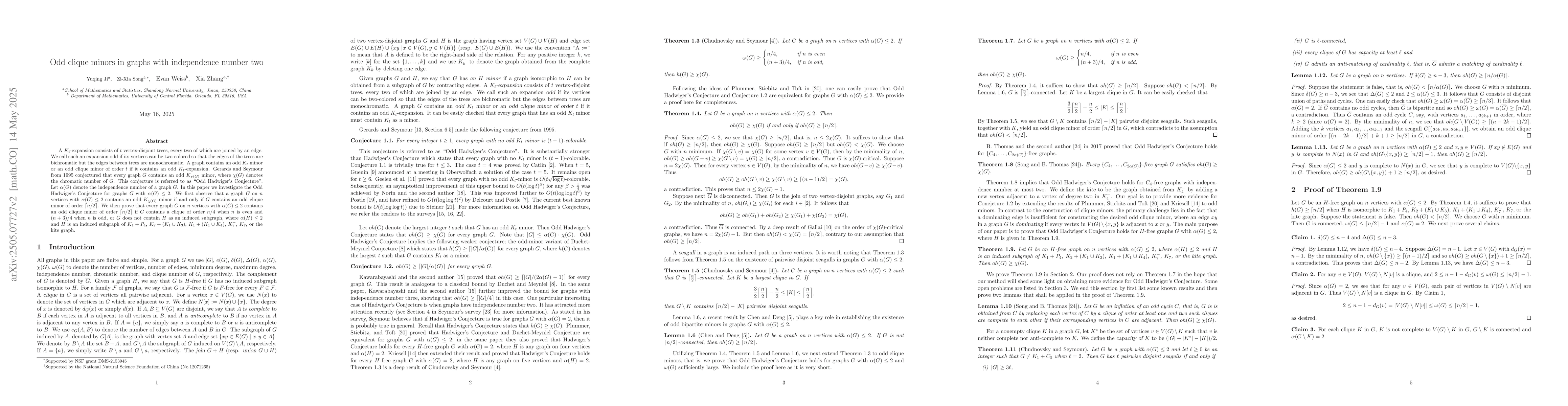 Research investigates Odd Hadwiger's Conjecture for graphs with independence number two, showing that such graphs contain odd clique minors of order $rac{n}{2}$ under specific conditions.