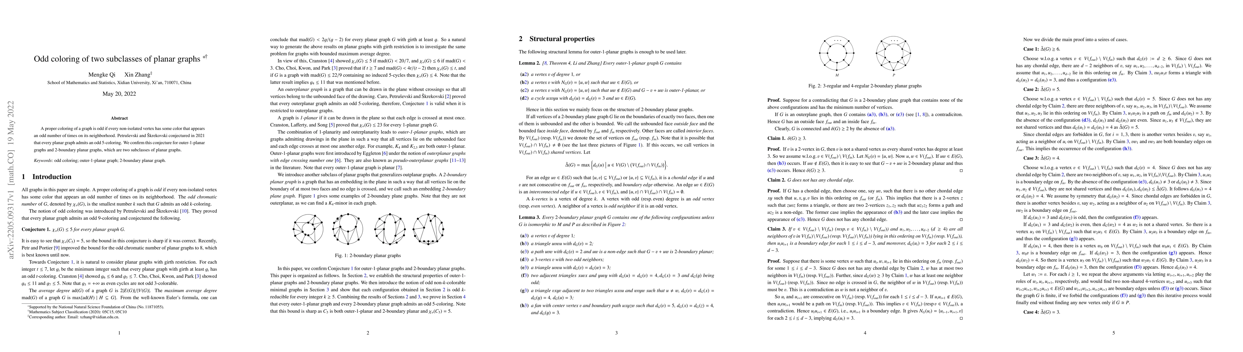 The paper presents detailed lemmas and proofs for odd reducibility of various graph configurations, leading to the confirmation of the conjecture for outer-1-planar and 2-boundary planar graphs.
