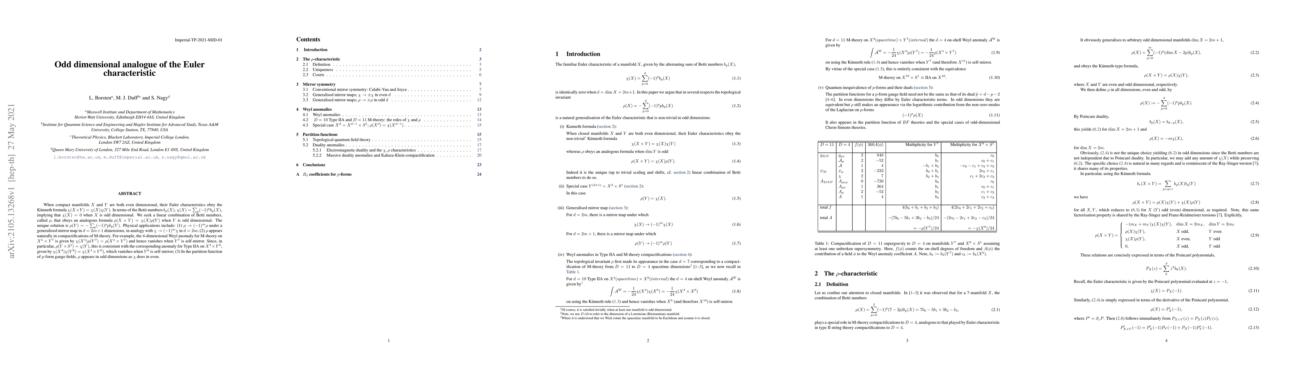 When compact manifolds $X$ and $Y$ are both even dimensional, their Euler characteristics obey the K\"unneth formula $\chi(X\times Y)=\chi(X) \chi(Y)$. In terms of the Betti numbers $b_p(X)$, $\chi(X)=\sum_{p}(-1)^p b_p(X)$, implying that $\chi(X)=0$ when $X$ is odd dimensional. We seek a linear combination of Betti numbers, called $\rho$, that obeys an analogous formula $\rho(X\times Y)=\chi(X) \rho(Y)$ when $Y$ is odd dimensional. The unique solution is $\rho(Y)=-\sum_{p}(-1)^p p b_p(Y)$. Physical applications include: (1) $\rho \rightarrow (-1)^m \rho $ under a generalized mirror map in $d=2m+1$ dimensions, in analogy with $\chi \rightarrow (-1)^m \chi $ in $d=2m$; (2) $\rho$ appears naturally in compactifications of M-theory. For example, the 4-dimensional Weyl anomaly for M-theory on $X^4 \times Y^7$ is given by $\chi(X^4)\rho(Y^7)=\rho(X^4 \times Y^7) $ and hence vanishes when $Y^7$ is self-mirror. Since, in particular, $\rho(Y\times S^1)=\chi(Y)$, this is consistent with the corresponding anomaly for Type IIA on $X^4 \times Y^6$, given by $\chi(X^4)\chi(Y^6)=\chi(X^4 \times Y^6)$, which vanishes when $Y^6$ is self-mirror; (3) In the partition function of $p$-form gauge fields, $\rho$ appears in odd dimensions as $\chi$ does in even.