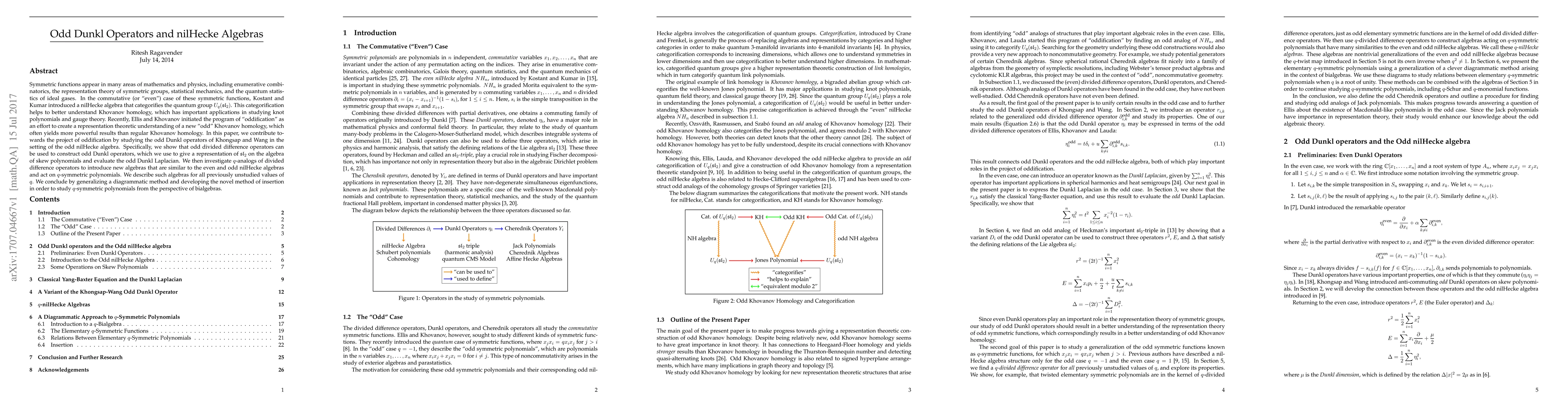 Symmetric functions appear in many areas of mathematics and physics, including enumerative combinatorics, the representation theory of symmetric groups, statistical mechanics, and the quantum statistics of ideal gases. In the commutative (or "even") case of these symmetric functions, Kostant and Kumar introduced a nilHecke algebra that categorifies the quantum group $U_q(\mathfrak{sl}_2)$. This categorification helps to better understand Khovanov homology, which has important applications in studying knot polynomials and gauge theory. Recently, Ellis and Khovanov initiated the program of "oddification" as an effort to create a representation theoretic understanding of a new "odd" Khovanov homology, which often yields more powerful results than regular Khovanov homology. In this paper, we contribute towards the project of oddification by studying the odd Dunkl operators of Khongsap and Wang in the setting of the odd nilHecke algebra. Specifically, we show that odd divided difference operators can be used to construct odd Dunkl operators, which we use to give a representation of $\mathfrak{sl}_2$ on the algebra of skew polynomials and evaluate the odd Dunkl Laplacian. We then investigate $q$-analogs of divided difference operators to introduce new algebras that are similar to the even and odd nilHecke algebras and act on $q$-symmetric polynomials. We describe such algebras for all previously unstudied values of $q$. We conclude by generalizing a diagrammatic method and developing the novel method of insertion in order to study $q$-symmetric polynomials from the perspective of bialgebras.