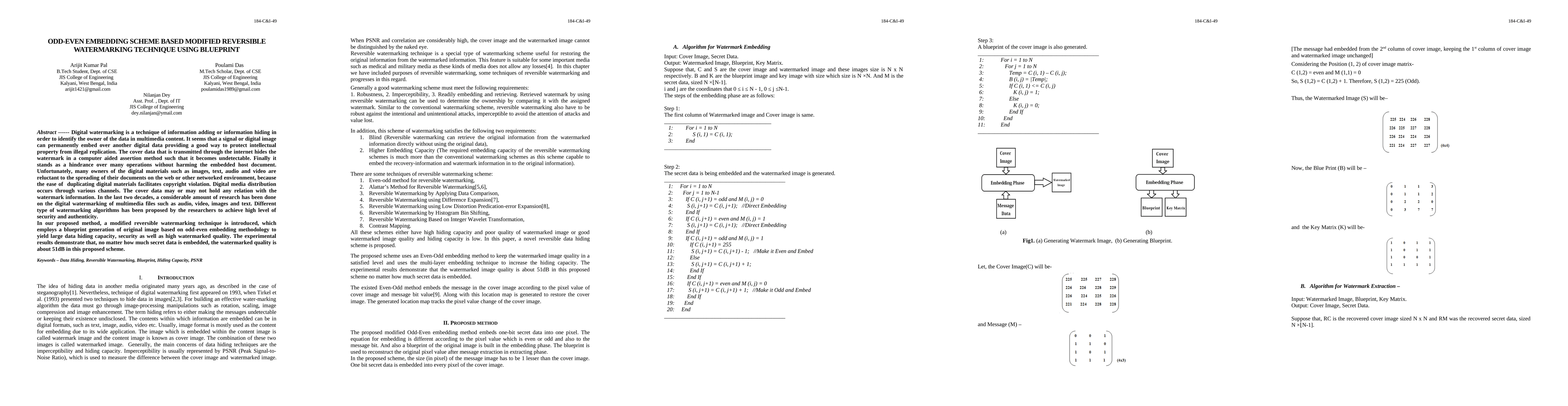 This paper proposes a modified reversible watermarking technique using an odd-even embedding scheme with blueprint generation to enhance data hiding capacity, security, and watermarked image quality. Experimental results show that the method maintains high watermarked image quality (around 51dB) regardless of the amount of embedded data.