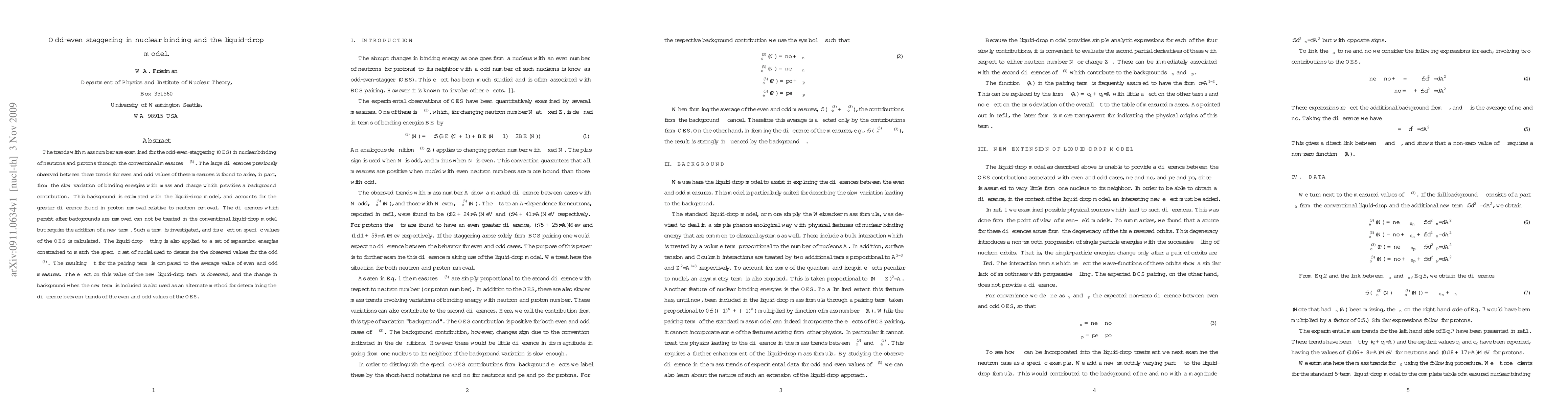 The research employs the liquid-drop model to analyze the odd-even staggering (OES) in nuclear binding energies for neutrons and protons, examining the differences between even and odd values through the measure Δ(3). It distinguishes background contributions from slow variations in binding energies and proposes a new term, η(A), to account for unresolved differences in OES trends.