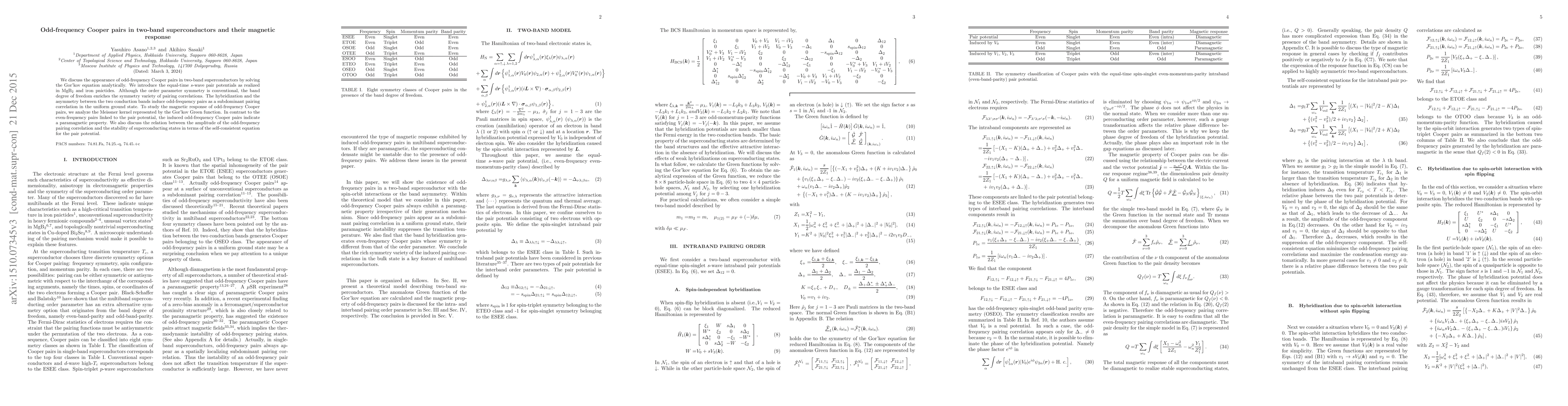 This paper explores odd-frequency Cooper pairs in two-band superconductors, revealing their paramagnetic properties through the analysis of the Meissner effect. The study uses the Gor'kov equation to analytically identify these pairs, which emerge due to band hybridization in materials like MgB$_2$ and iron pnictides.