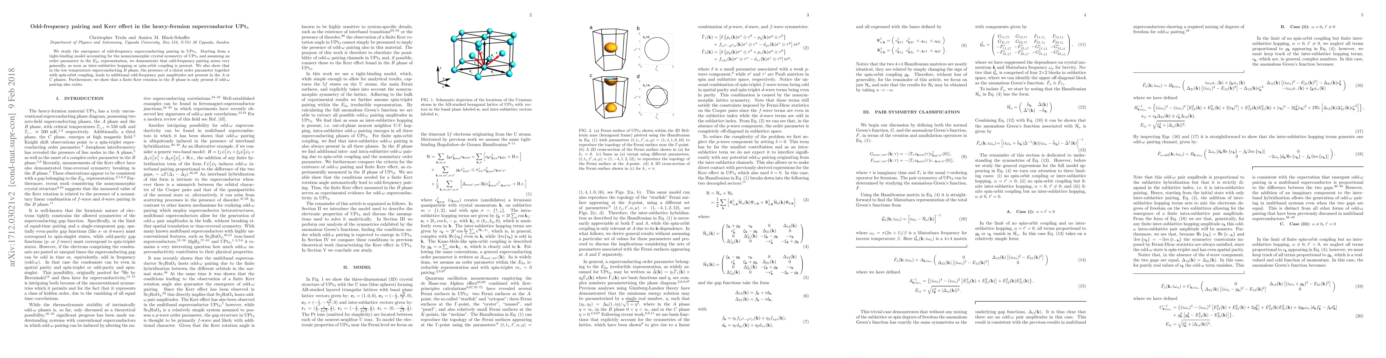 This research identifies odd-frequency superconducting pairing in UPt3, showing its emergence from inter-sublattice hopping or spin-orbit coupling. It also links the Kerr effect in UPt3's low-temperature 'B' phase superconductivity to the presence of odd-frequency pairing and chiral order parameter with spin-orbit coupling.