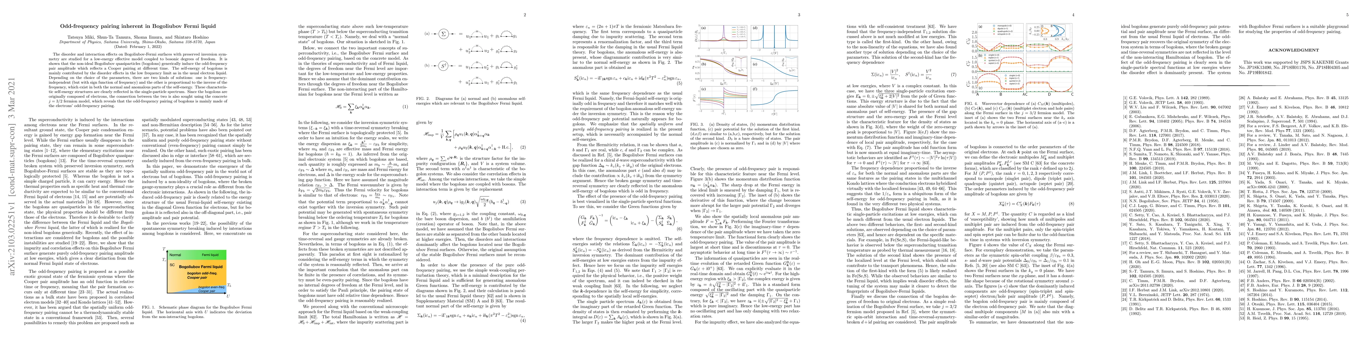 This paper investigates the effects of disorder and interactions in Bogoliubov Fermi liquids, revealing that non-ideal quasiparticles induce odd-frequency pair amplitudes, indicating Cooper pairing at different times. The study finds two distinct self-energy solutions, with the disorder primarily contributing to the low-frequency limit, and establishes a connection between these quasiparticles and electron odd-frequency pairing.