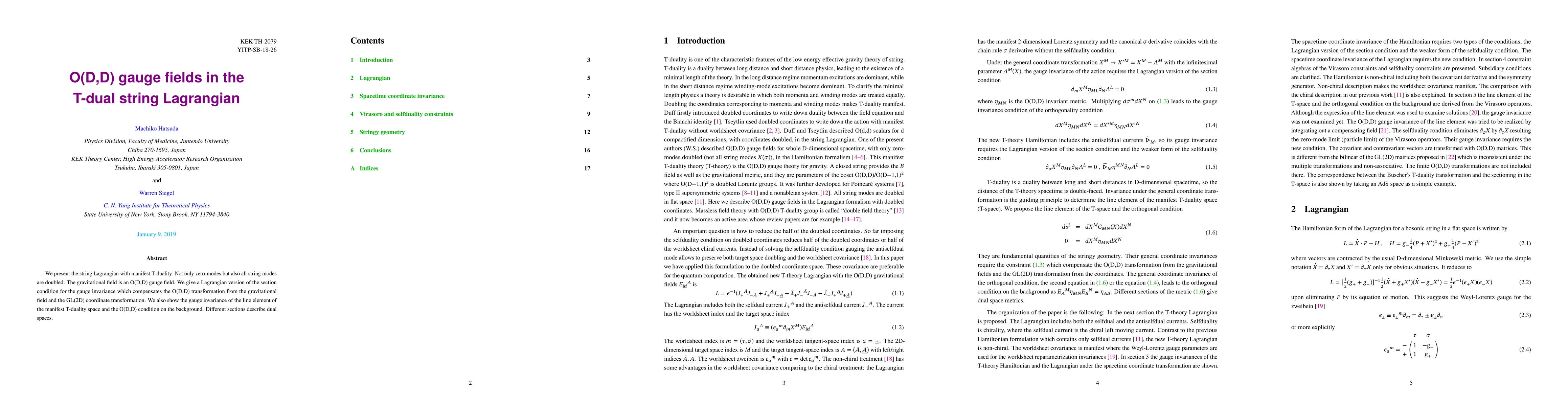 We present the string Lagrangian with manifest T-duality. Not only zero-modes but also all string modes are doubled. The gravitational field is an O(D,D) gauge field. We give a Lagrangian version of the section condition for the gauge invariance which compensates the O(D,D) transformation from the gravitational field and the GL(2D) coordinate transformation. We also show the gauge invariance of the line element of the manifest T-duality space and the O(D,D) condition on the background. Different sections describe dual spaces.