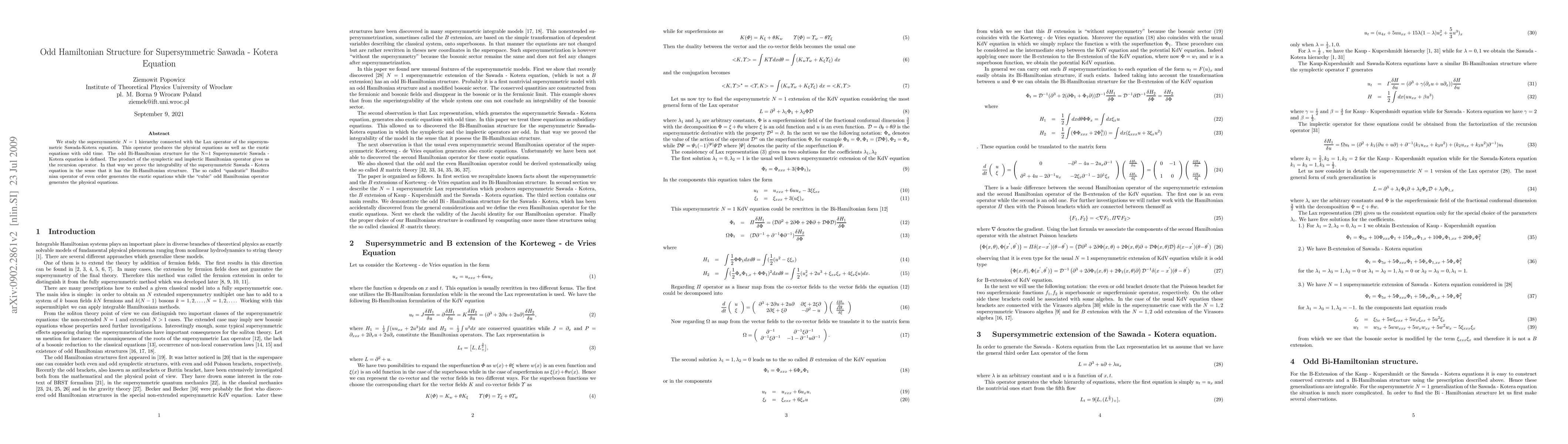 This paper explores the supersymmetric N=1 hierarchy related to the Lax operator of the supersymmetric Sawada-Kotera equation, revealing an odd Bi-Hamiltonian structure that confirms its integrability through a recursion operator. The study differentiates between "quadratic" even Hamiltonian operators generating exotic equations and "cubic" odd Hamiltonian operators generating physical equations.