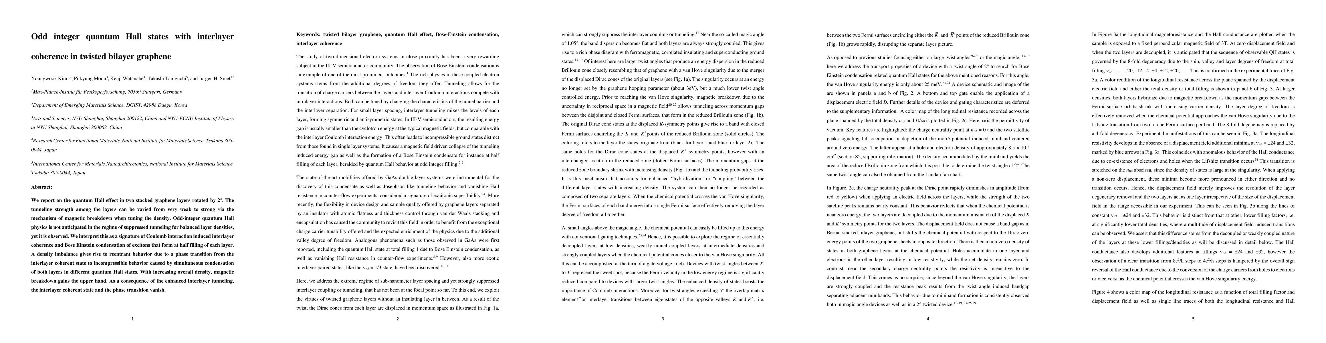 This study observes odd-integer quantum Hall states in twisted bilayer graphene, suggesting Coulomb interaction-induced interlayer coherence and exciton condensation. Density imbalance leads to reentrant behavior and phase transitions, while enhanced interlayer tunneling diminishes these effects.
