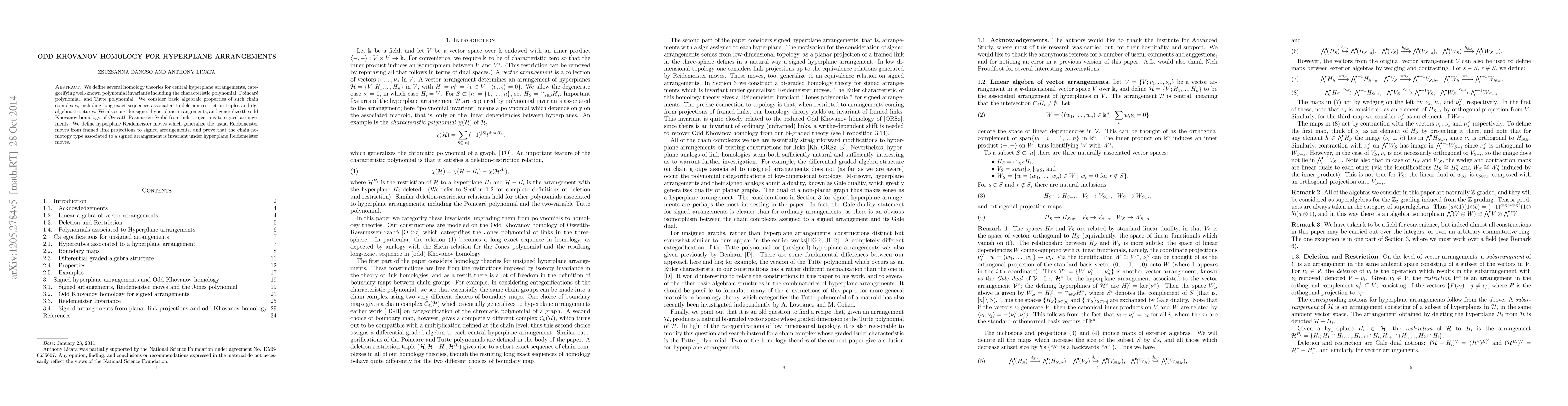 This paper introduces homology theories for central hyperplane arrangements, categorifying polynomial invariants like the characteristic, Poincare, and Tutte polynomials. It generalizes odd Khovanov homology to signed hyperplane arrangements, defines hyperplane Reidemeister moves, and proves invariance under these moves.
