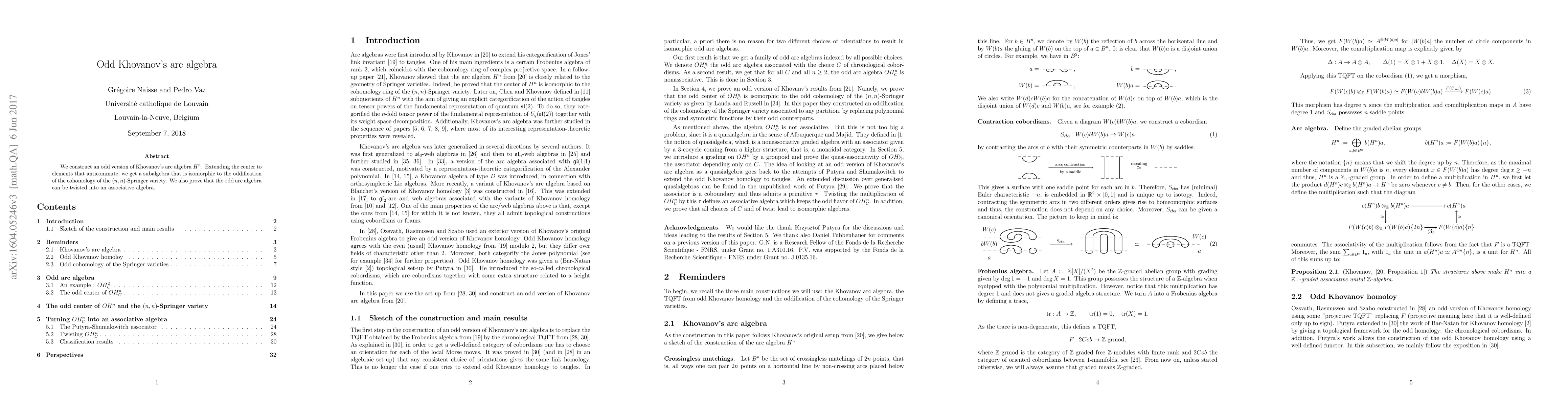 Summary: This paper introduces an odd variant of Khovanov's arc algebra, demonstrating its isomorphism with the oddification of $(n,n)$-Springer variety cohomology and proving its potential for associative algebra twisting.