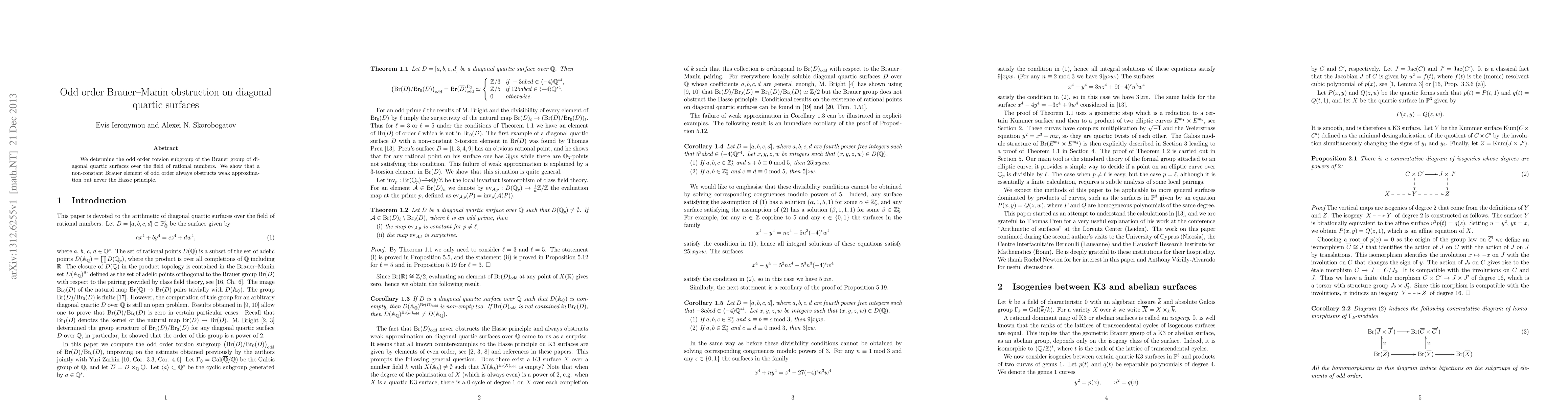 Summary: This paper identifies the odd order torsion subgroup of the Brauer group for diagonal quartic surfaces over rational numbers. It demonstrates that odd order Brauer elements always cause a Brauer-Manin obstruction to weak approximation but do not interfere with the Hasse principle.