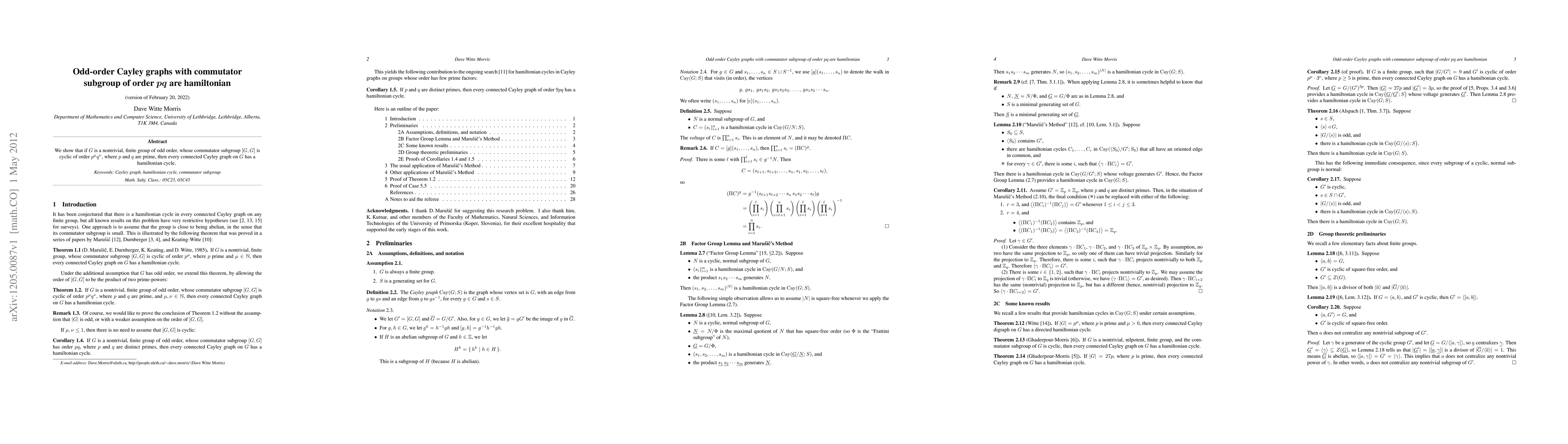 We show that if G is a nontrivial, finite group of odd order, whose commutator subgroup [G,G] is cyclic of order p^m q^n, where p and q are prime, then every connected Cayley graph on G has a hamiltonian cycle.