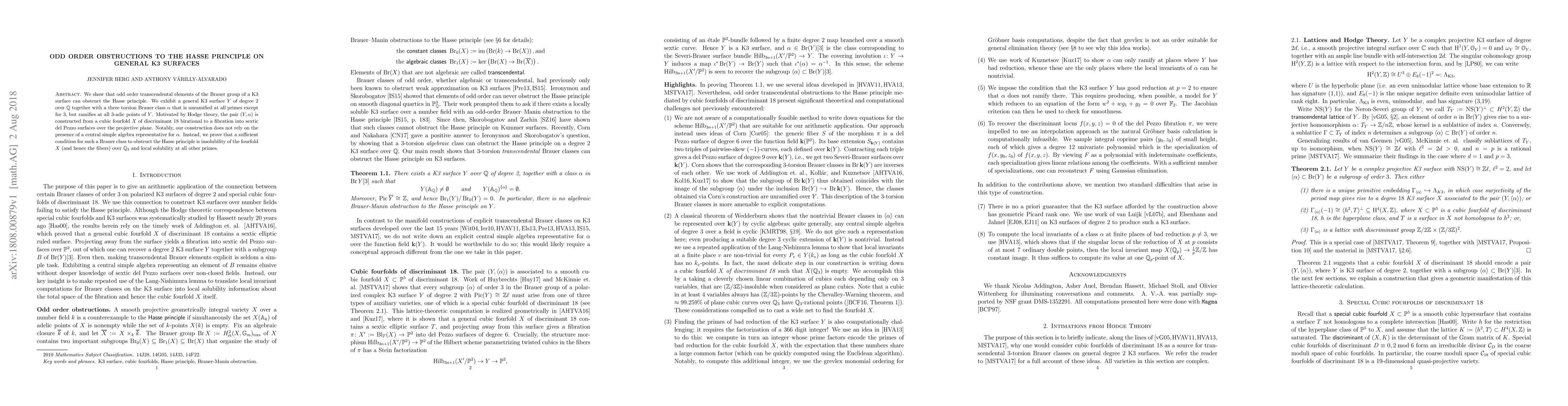 We show that odd order transcendental elements of the Brauer group of a K3 surface can obstruct the Hasse principle. We exhibit a general K3 surface $Y$ of degree 2 over $\mathbb{Q}$ together with a three torsion Brauer class $\alpha$ that is unramified at all primes except for 3, but ramifies at all 3-adic points of $Y$. Motivated by Hodge theory, the pair $(Y, \alpha)$ is constructed from a cubic fourfold $X$ of discriminant 18 birational to a fibration into sextic del Pezzo surfaces over the projective plane. Notably, our construction does not rely on the presence of a central simple algebra representative for $\alpha$. Instead, we prove that a sufficient condition for such a Brauer class to obstruct the Hasse principle is insolubility of the fourfold $X$ (and hence the fibers) over $\mathbb{Q}_3$ and local solubility at all other primes.