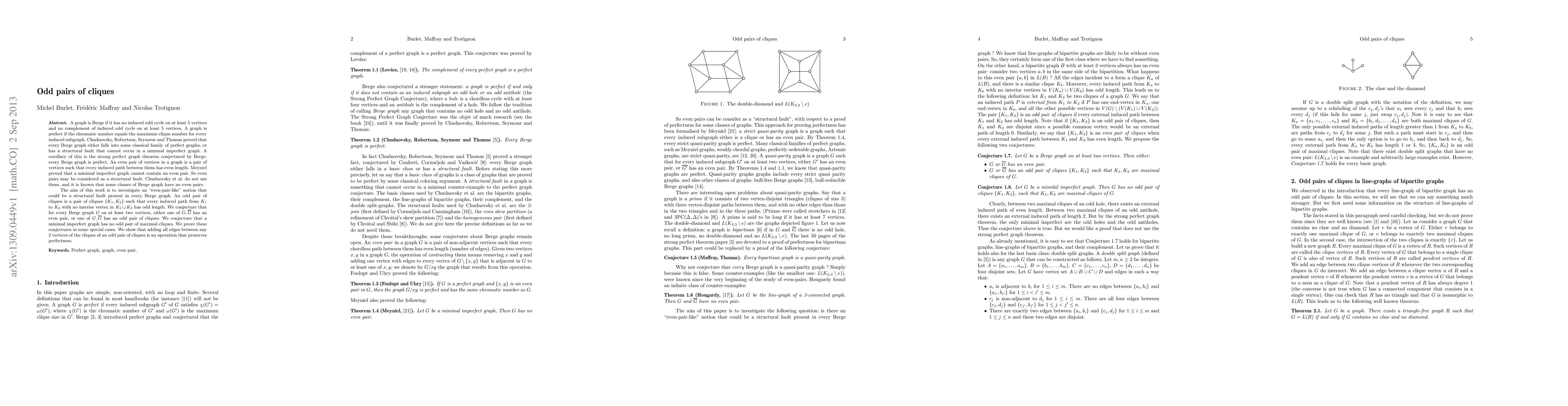 A graph is Berge if it has no induced odd cycle on at least 5 vertices and no complement of induced odd cycle on at least 5 vertices. A graph is perfect if the chromatic number equals the maximum clique number for every induced subgraph. Chudnovsky, Robertson, Seymour and Thomas proved that every Berge graph either falls into some classical family of perfect graphs, or has a structural fault that cannot occur in a minimal imperfect graph. A corollary of this is the strong perfect graph theorem conjectured by Berge: every Berge graph is perfect. An even pair of vertices in a graph is a pair of vertices such that every induced path between them has even length. Meyniel proved that a minimal imperfect graph cannot contain an even pair. So even pairs may be considered as a structural fault. Chudnovsky et al. do not use them, and it is known that some classes of Berge graph have no even pairs. The aim of this work is to investigate an "even-pair-like" notion that could be a structural fault present in every Berge graph. An odd pair of cliques is a pair of cliques $\{K_1, K_2\}$ such that every induced path from $K_1$ to $K_2$ with no interior vertex in $K_1 \cup K_2$ has odd length. We conjecture that for every Berge graph $G$ on at least two vertices, either one of $G, \bar{G}$ has an even pair, or one of $G, \bar{G}$ has an odd pair of cliques. We conjecture that a minimal imperfect graph has no odd pair of maximal cliques. We prove these conjectures in some special cases. We show that adding all edges between any 2 vertices of the cliques of an odd pair of cliques is an operation that preserves perfectness.