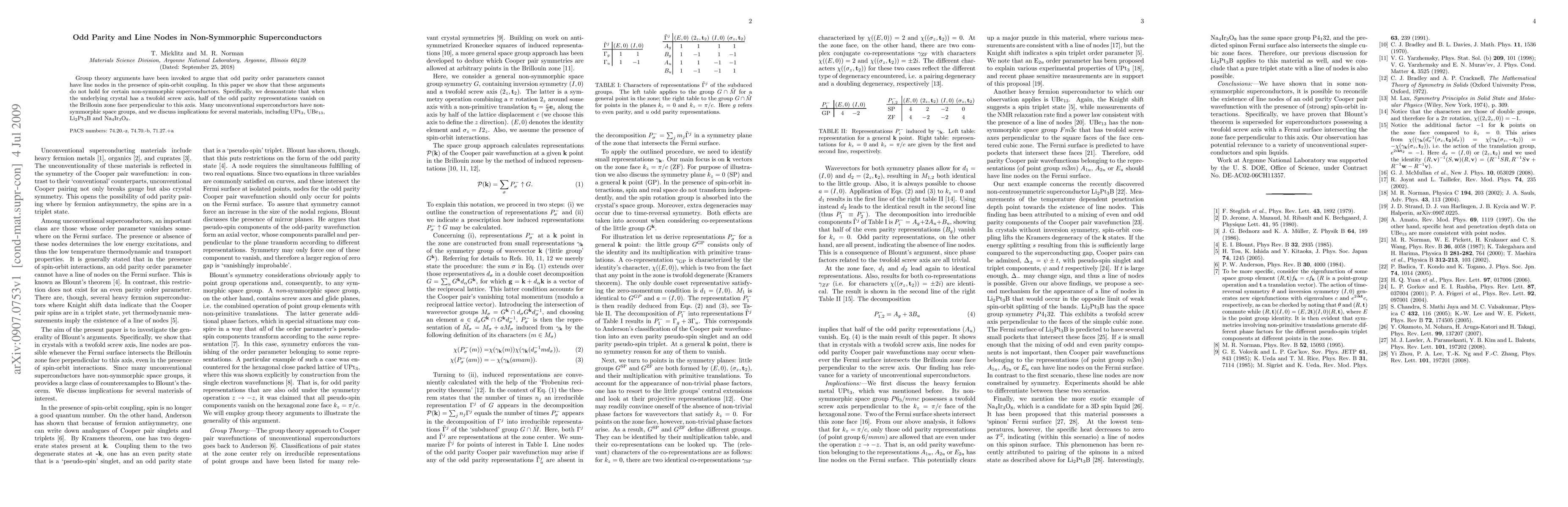 This paper demonstrates that odd parity superconducting order parameters can exhibit line nodes in non-symmorphic superconductors, contrary to previous group theory arguments. It highlights the role of a twofold screw axis in vanishing half of the odd parity representations, with implications for unconventional superconductors like UPt3, UBe13, Li2Pt3B, and Na4Ir3O8.