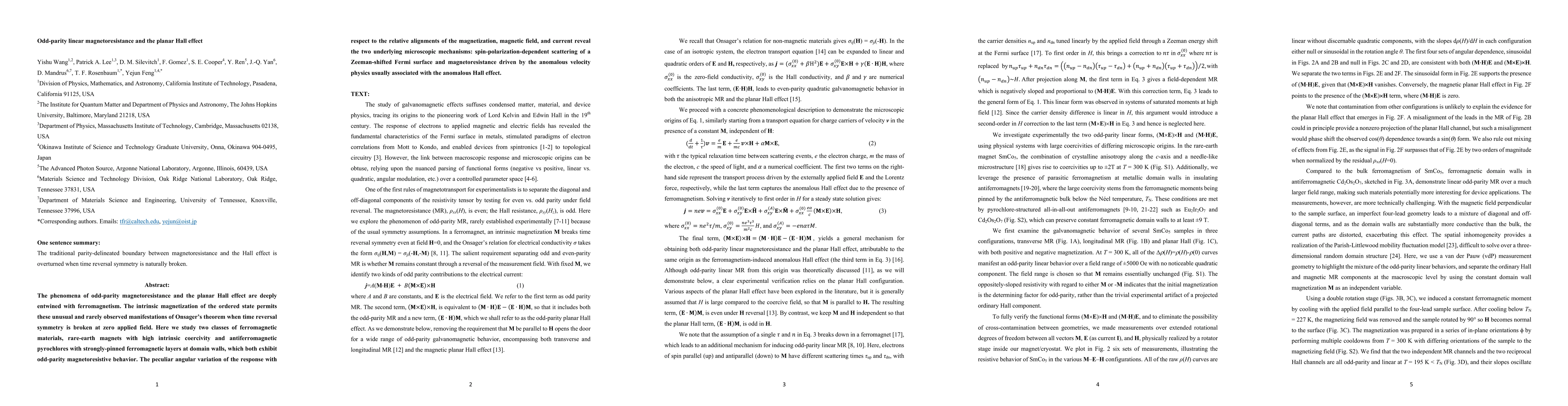 This paper investigates odd-parity magnetoresistance and the planar Hall effect in ferromagnetic materials, revealing two mechanisms: spin-polarization-dependent scattering and anomalous velocity physics. The study focuses on rare-earth magnets and antiferromagnetic pyrochlores, highlighting their unique angular responses.