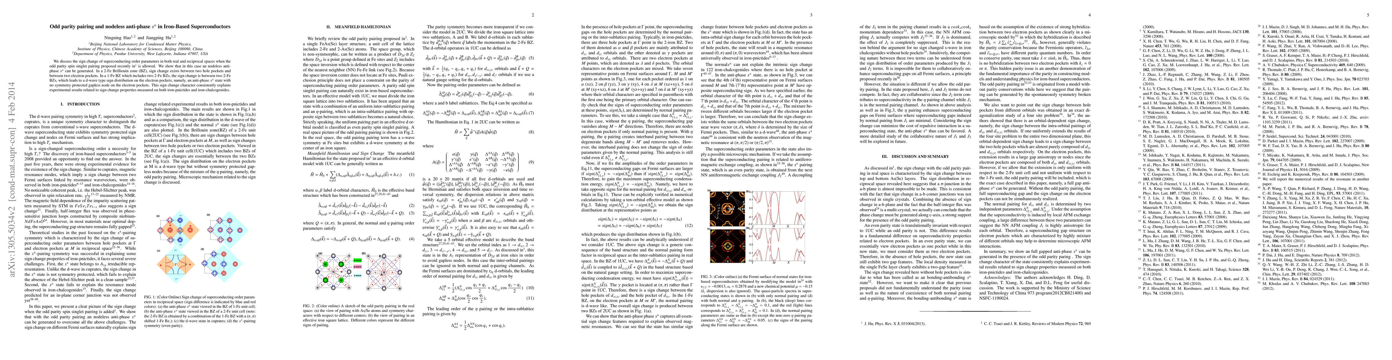 This paper explores the implications of odd parity spin singlet pairing in iron-based superconductors, demonstrating the generation of a nodeless anti-phase $s^\pm$ state without symmetry-protected gapless nodes, consistent with experimental observations of sign changes in both iron-pnictides and iron-chalcogenides.