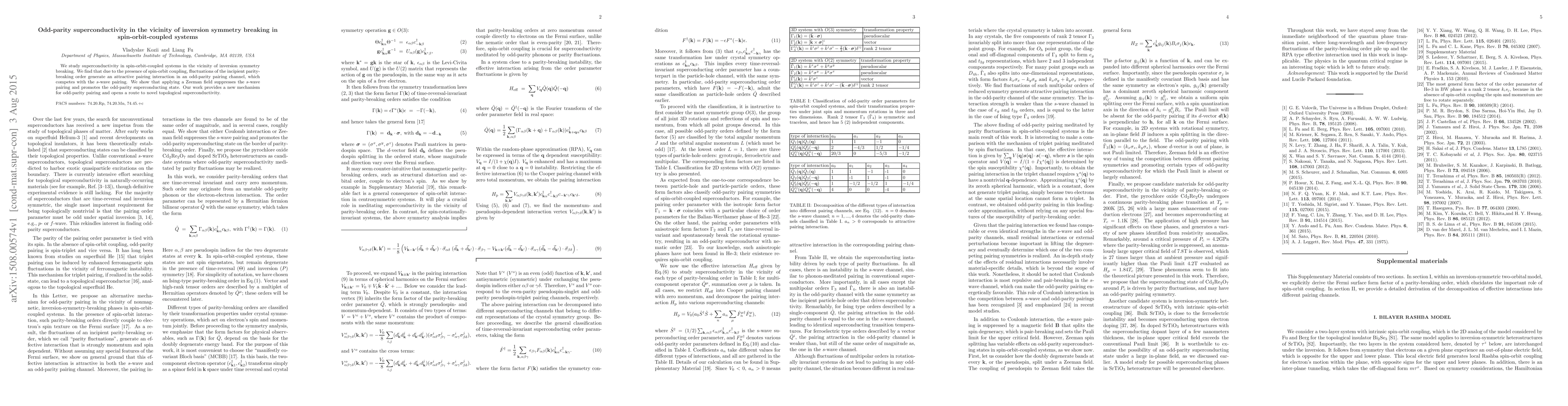 We study superconductivity in spin-orbit-coupled systems in the vicinity of inversion symmetry breaking. We find that due to the presence of spin-orbit coupling, fluctuations of the incipient parity-breaking order generate an attractive pairing interaction in an odd-parity pairing channel, which competes with the s-wave pairing. We show that applying a Zeeman field suppresses the s-wave pairing and promotes the odd-parity superconducting state. Our work provides a new mechanism for odd-parity pairing and opens a route to novel topological superconductivity.